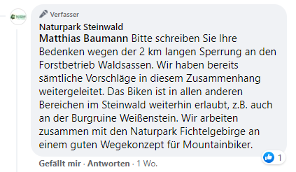 eben hatte ich auf meiner Hausrunde eine kleine Unterhaltung mit einem Waldbesitzer der dabei war einen Trail mit Baumstämmen zu versperren und wüsste mal gerne eure Meinung dazu.