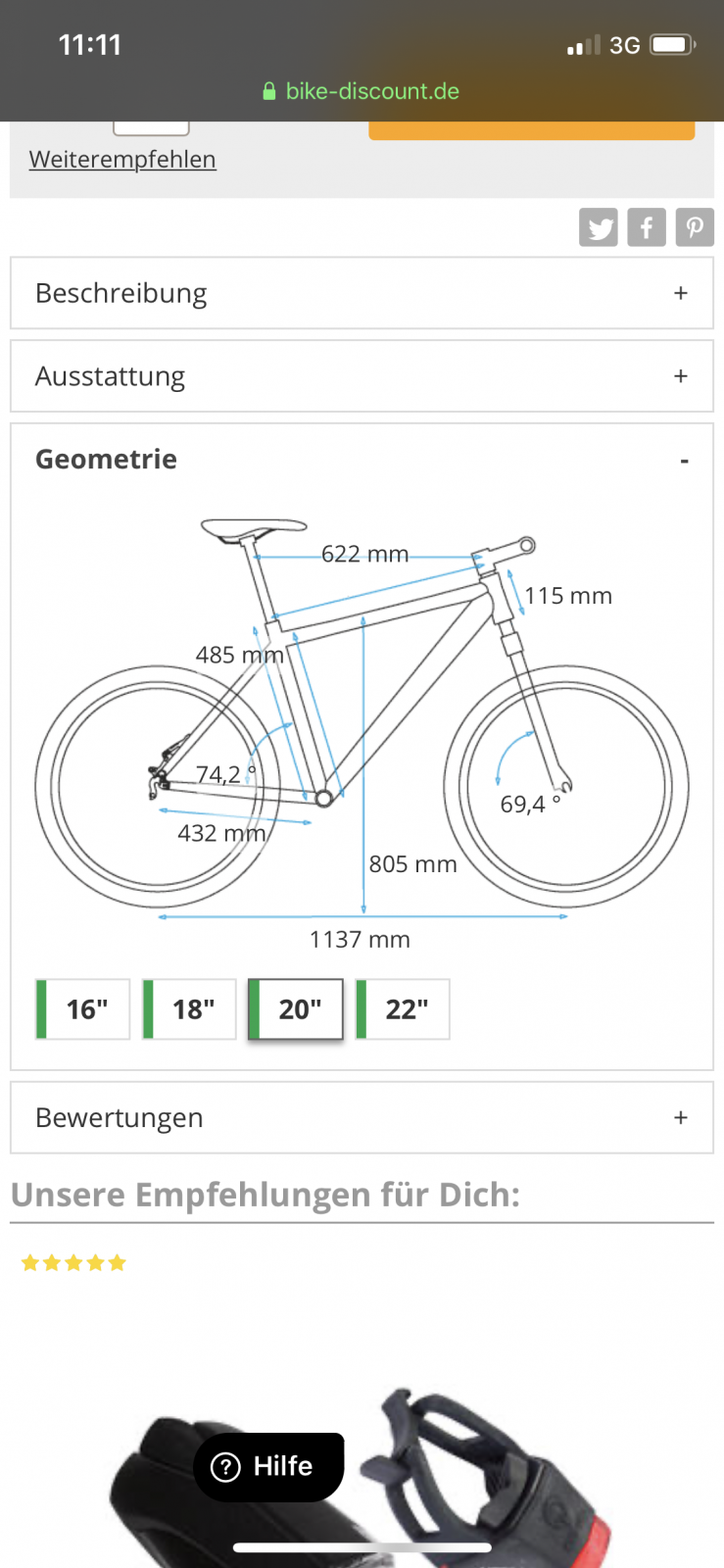 Radon gibt 20 bzw 21 Zoll an. Da brauche ich laut Rechner ein 20er aber das ist nur eine Spur größer als das 19er Cube. Wiederum das 22Zoll von Radon schätze ich dann zu groß ein für mich. Bin ja keine 195cm.