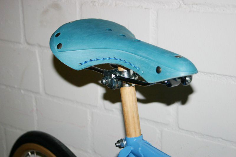 Wieder verwendet wurde die alte 3-Arm-Kurbel - welche ein neues Kettenblatt spendiert bekam -, die Chrom-Bahngabel, das Keil-Innenlager und der Renak-Steuersatz. Alte Hakenpedalen sollten das Komplettbild abrunden. Diesen spendierte ich neues Fett und blaue Christophe-Riemchen. Auf der Suche nach einem adäquaten Sattel stolperte ich über einen hellblauen Gyes-Ledersattel.