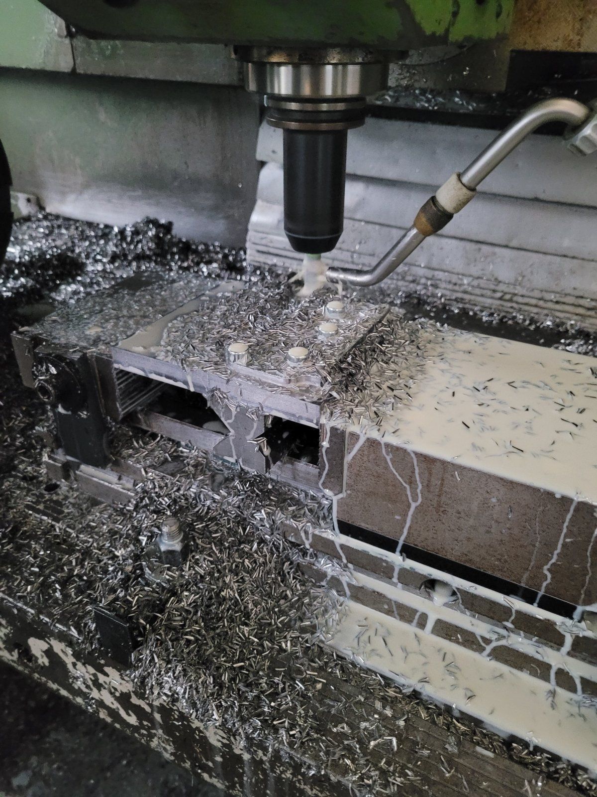 Nun ein zweites Stück Stahl geschnitten, auf Maß gefräst und in die Fräse gespannt, um die erste Seite des Yokes zu bearbeiten: