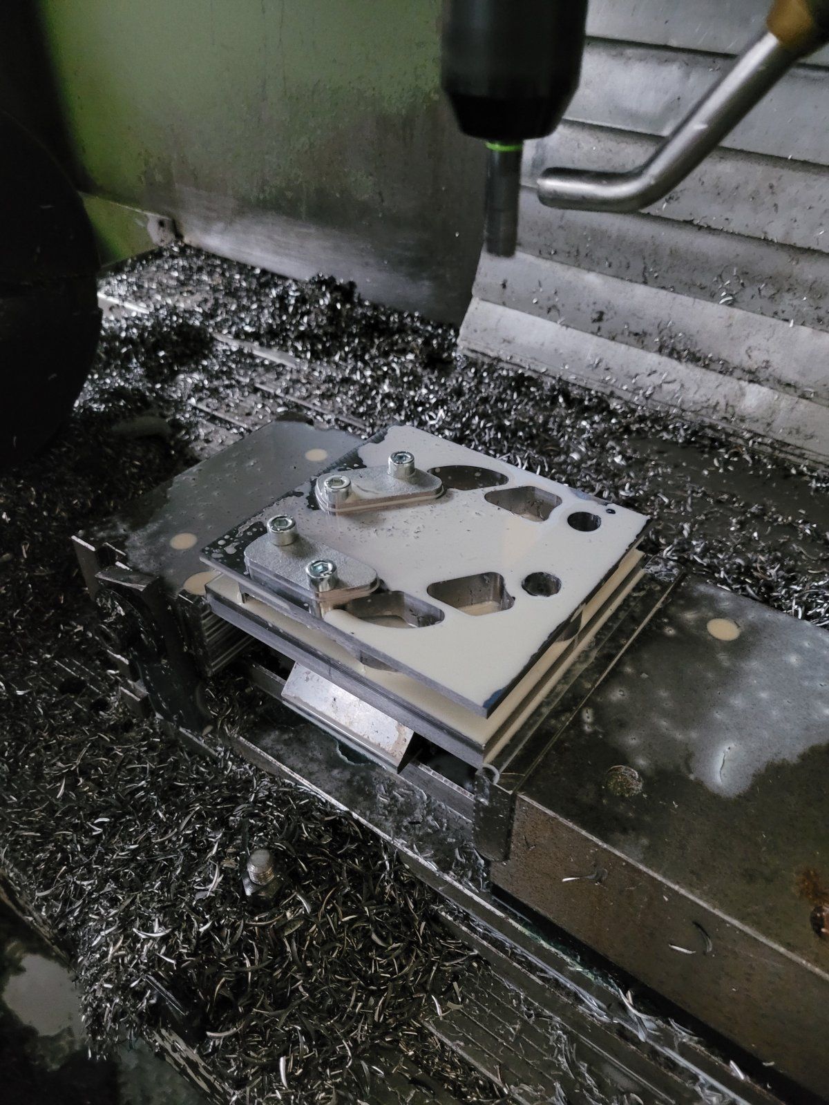 Für das neue Bauteil mussten dann erst einmal wieder lauter neue Fräsoperationen her. Da man die Teile aufgrund ihrer Hübsch'schkeit nicht einfach irgendwo spannen kann, mussten auch Halterungen und Vorrichungen neu gemacht werden:
