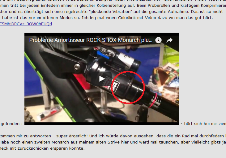 ich poste mein Problem hier auch mal in der Hoffnung auf Hilfe. Hab mir am WE ein neues Canyon Strive AL 5.0 2017 zugelegt. Ich habe ein Problem mit dem Monarch- jedenfalls denke ich es am Dämpfer lokalisiert zu haben.
