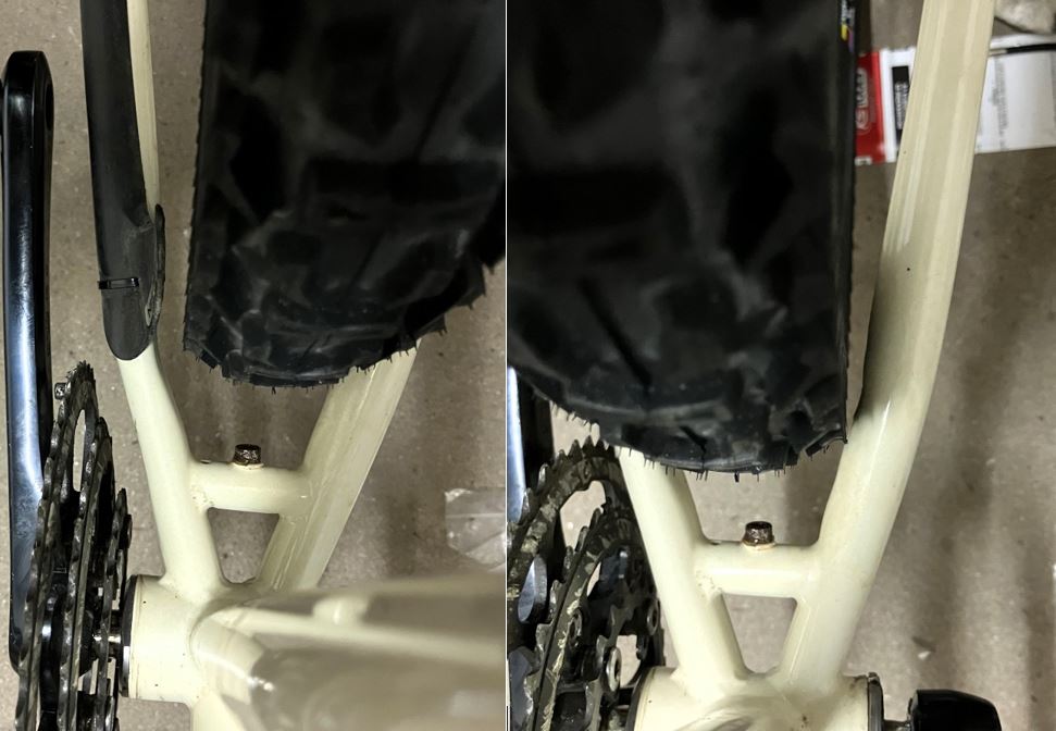 Tatsächlich ist da überhaupt keine Schleifspur an der Kettenstrebe, alles normal. Kann es sein, dass der Rahmen beim Transport so richtig eine von links bekommen hat?Hat da mal ein Reifen geschliffen?