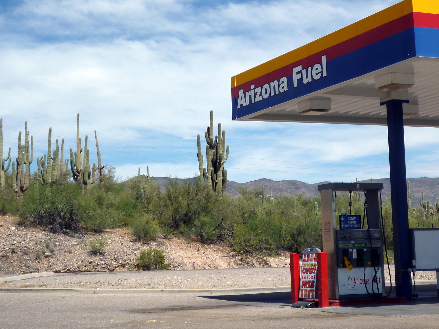 Und ein paar Meter den Highway hinauf gibts dann auch endlich Arizona Fuel! Für Zorro bedeutet das meistens einen Eimer eiskalte Coke, aber diesmal füll ich mir statt dessen Slush Puppie Himbeer ein. Genial!!
