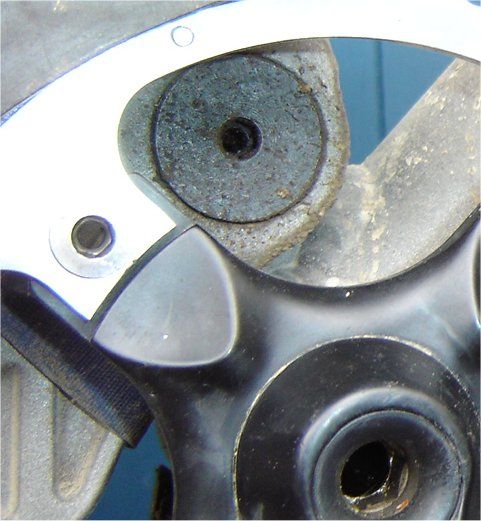 Da das Ausfallende schon ein drei 6mm Löcher hatte von dilettantischen Versuchen der Vorbesitzer, irgendwelche schrottigen Anschraub- Disk-Adapter zu befestigen, habe ich eins der Löcher benutzt, um die Drehmomentstütze (abgesägte und durchgebohrte OEM2) dort mit einer 6mm-Schraube zu befestigen. In die anderen Löcher habe ich 4mm-Schrauben gedreht mit Mutter hinten und überpulvern lassen.