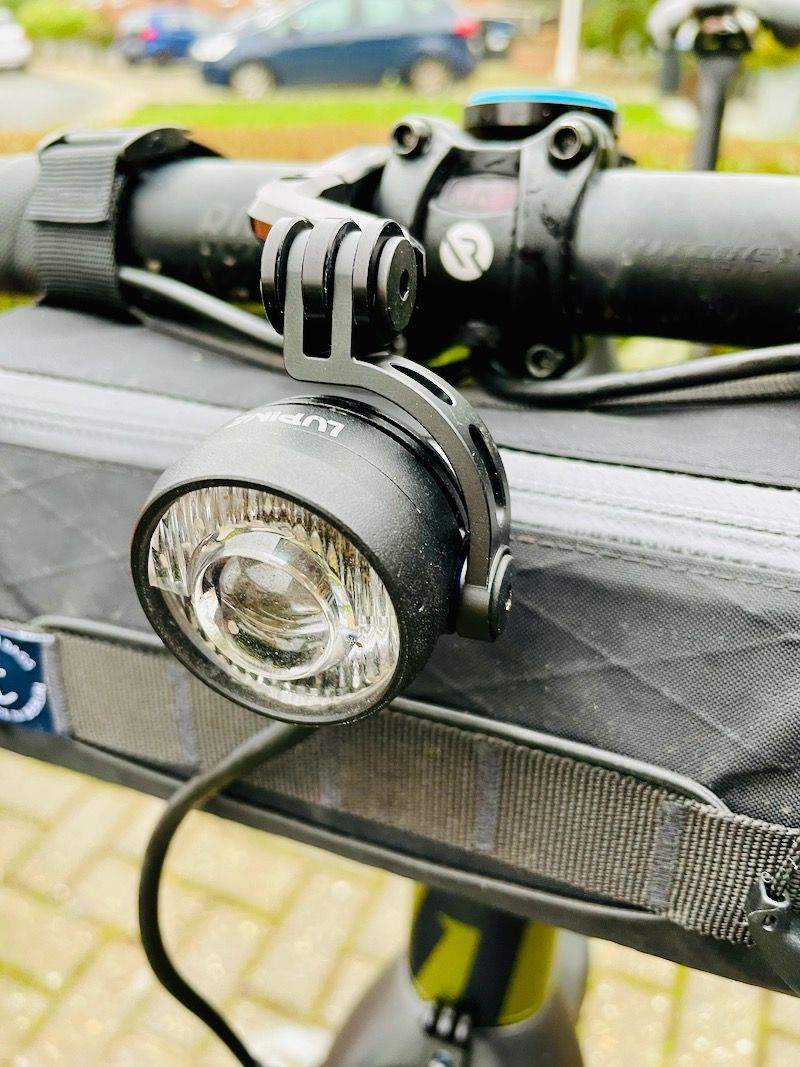 Ich habe ja als Ausleuchtung die Lupine SL nano AF am Rad, am Lenker. Jetzt ist es so, dass beim Einsatz einer Lenkertasche wie ich sie habe erst mal der Zugriff auf die Tasche eingeschränkt ist, und die Zuleitung unter der Lampe geknickt ist. Ich habe zwar versucht mit einem GoPro Halter von k-edge das ganze etwas weiter vor zu bringen, aber wirklich besser ist es nicht geworden: