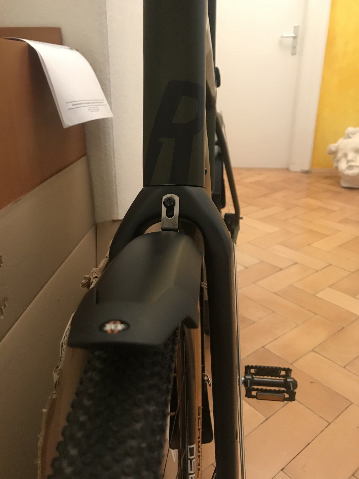 Schutzbleche passen Breite technisch gerade so rein, das passt also. Was aber unschön ist, ist das Unterlegen von ca. 6 mm Spacern zwischen Gabel Schraubpunkt unten und den Ösen des Schutzblechs. Da es untenrum recht breit wird, müssen die Streben schon eine leichte Biegung nach innen hin machen. Habe mir da mal selber leicht angewinkelte Spacer im 3D Drucker gedruckt, müssten aber vermutlich noch weiter angewinkelt werden. Bin aber gerade am überlegen, mir doch einfach die SKS Speedrocker zu holen.