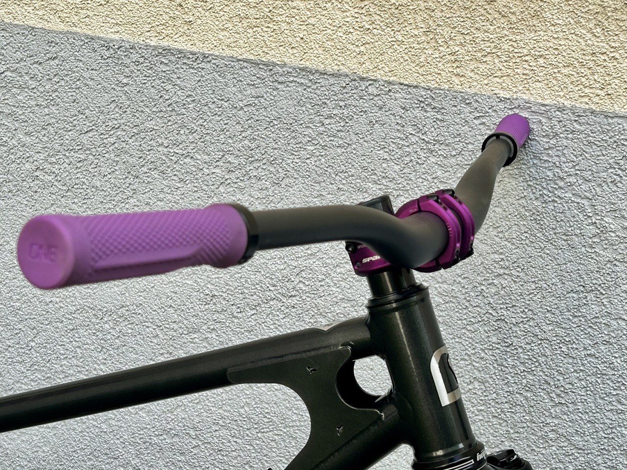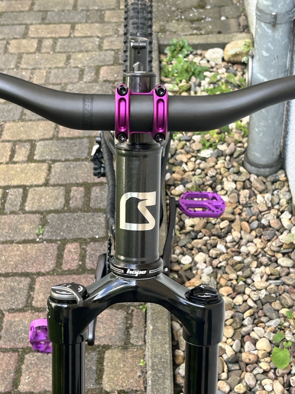 Die Bomber muss noch von 170 auf 150 getravelt werden. Ansonsten wird eine 12-fach Shimano Gruppe (30Z / 10-51) verbaut. Der Carbonlenker ist von Cannondale und hat 80cm. Griffe und Pedale kommen aus dem HRL und sind von Oneup.