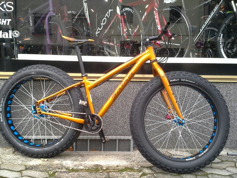 Ich nehm an, dass der Salsa-Adapter von 135 auf 170mm verbaut ist. Das Hinterrad könnte also auch mit nem Pugsleyverwendet werden.Da sieht man mal, was mit den Alternator Dropouts alles möglich ist. 135mm Hinterachse, Kettenspanner... Ist das Hinterrad symmetrisch eingespeicht?