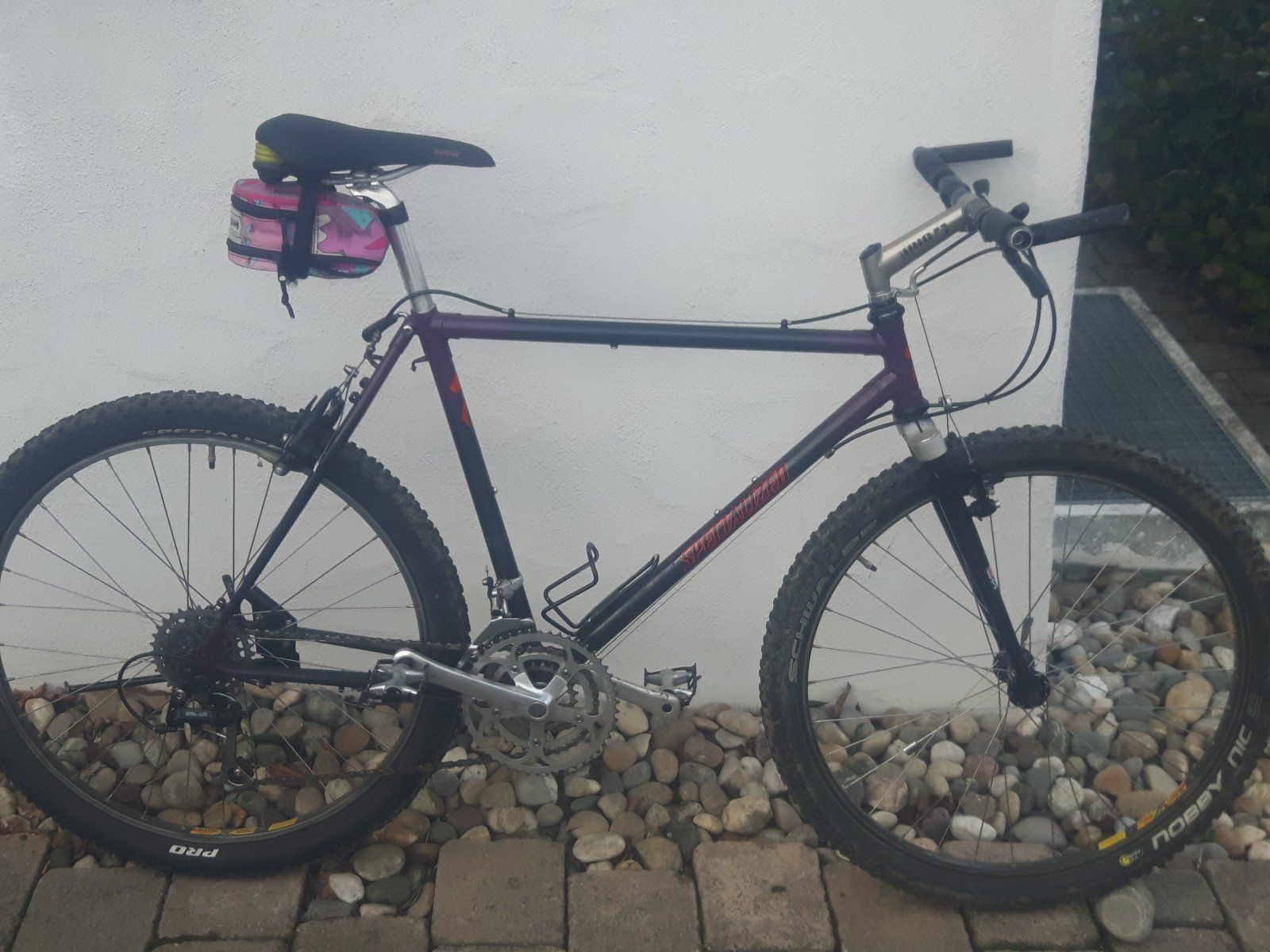 Mittlerweile kommen mir starke Zweifel dass es ein überhaupt ein Specialized-Rahmen ist. Aber auch wenn man sich die Decals wegdenkt ist die zweifarbige Lackierung lila-schwarz mir nicht geläufig zwischen 1990 und 1994 (wegen schwarzen LX-Teilen). Die hintere U-Brake wäre eher ein Hinweis auf ca. 1989