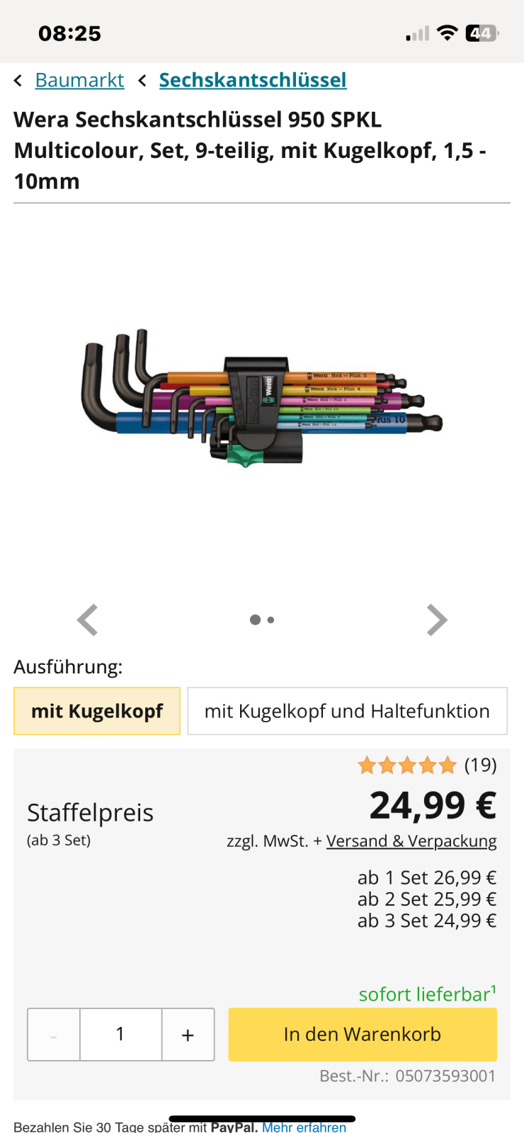 Bei mir werden 24,99 zzgl. MwSt. angezeigt, allerdings erst ab der Abnahme Menge von drei Stück. Einzeln 26,99 zzgl. MwSt.Wer auf der Suche nach guten Sechskantschlüsseln ist. Bei Böttcher gibt es gerade den Satz für 22euro. Seit Jahren in gebrauch und keine ausgenudelten Schrauben mehr.