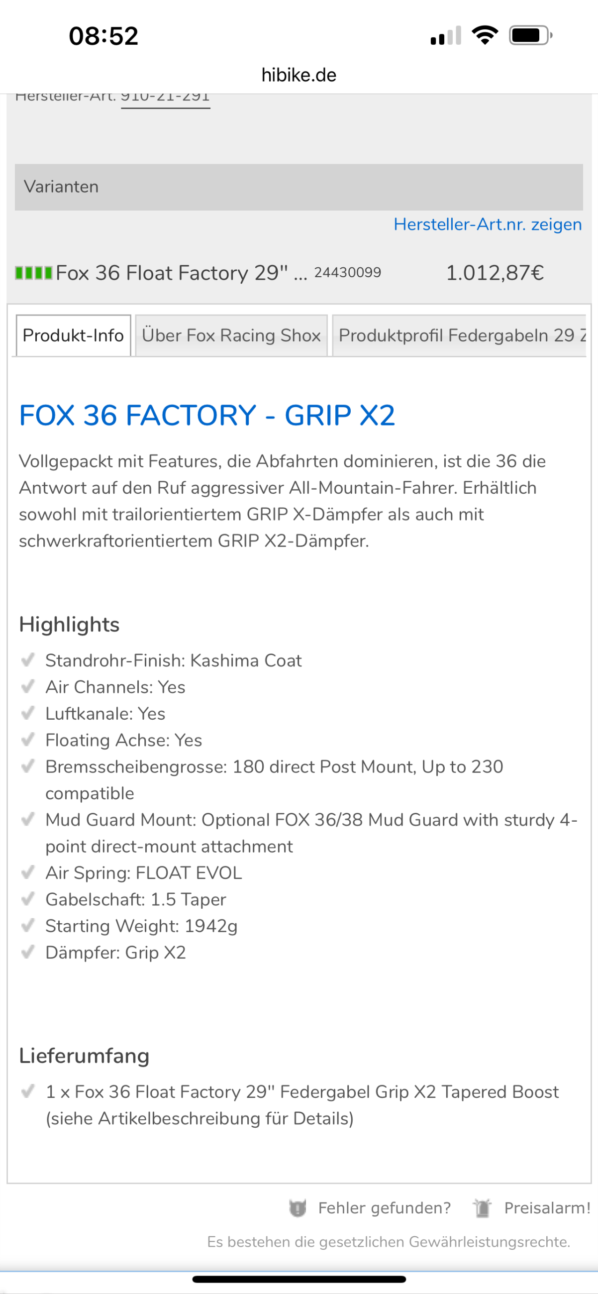 Wenn die Artikelnummer bei BD stimmt handelt es sich um folgende 36er:Fox Factory 36 Grip2 29" 160mm 599€