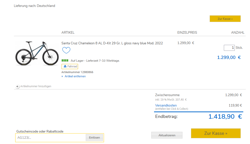 Ich versuche es gerade aber es lädt nicht mal den Warenkorb. In einem anderen Browser wird der Artikel als nicht verfügbar angezeigt.ja bei mir auch mit dem Newmen Evolution SL A.30 27,5" 6-Loch Sram XD![]()