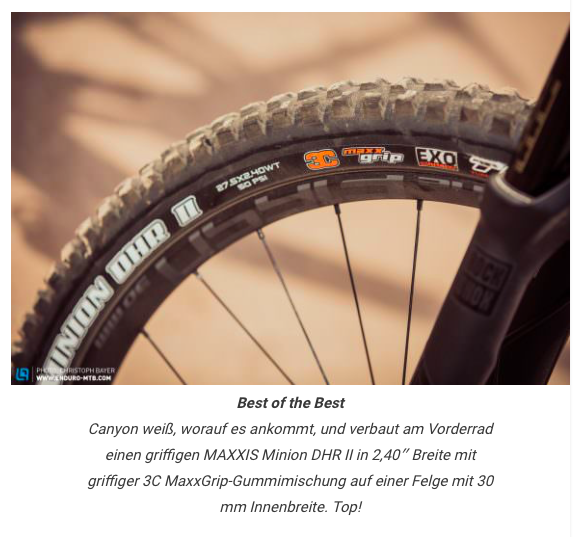 Canyon weiß, worauf es ankommt, und verbaut am Vorderrad einen griffigen MAXXIS Minion DHR II in 2,40″ Breite mit griffiger 3C MaxxGrip-Gummimischung auf einer Felge mit 30 mm Innenbreite. Top!"