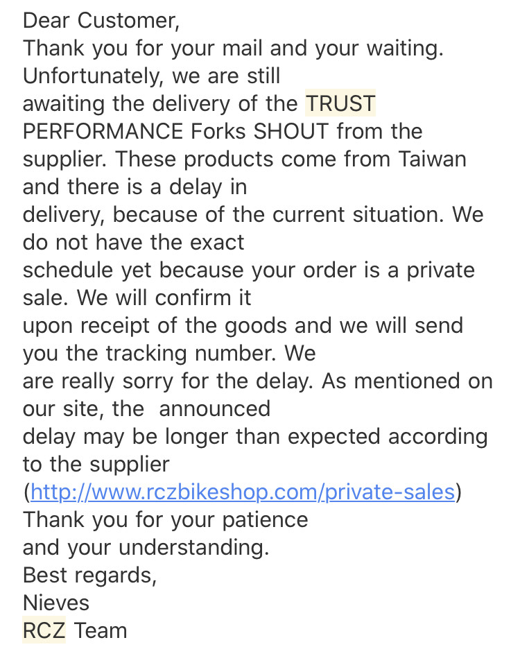 die Leute die im Jan oder Mai die Trust Performance gabel bestellt haben warten immer noch.
