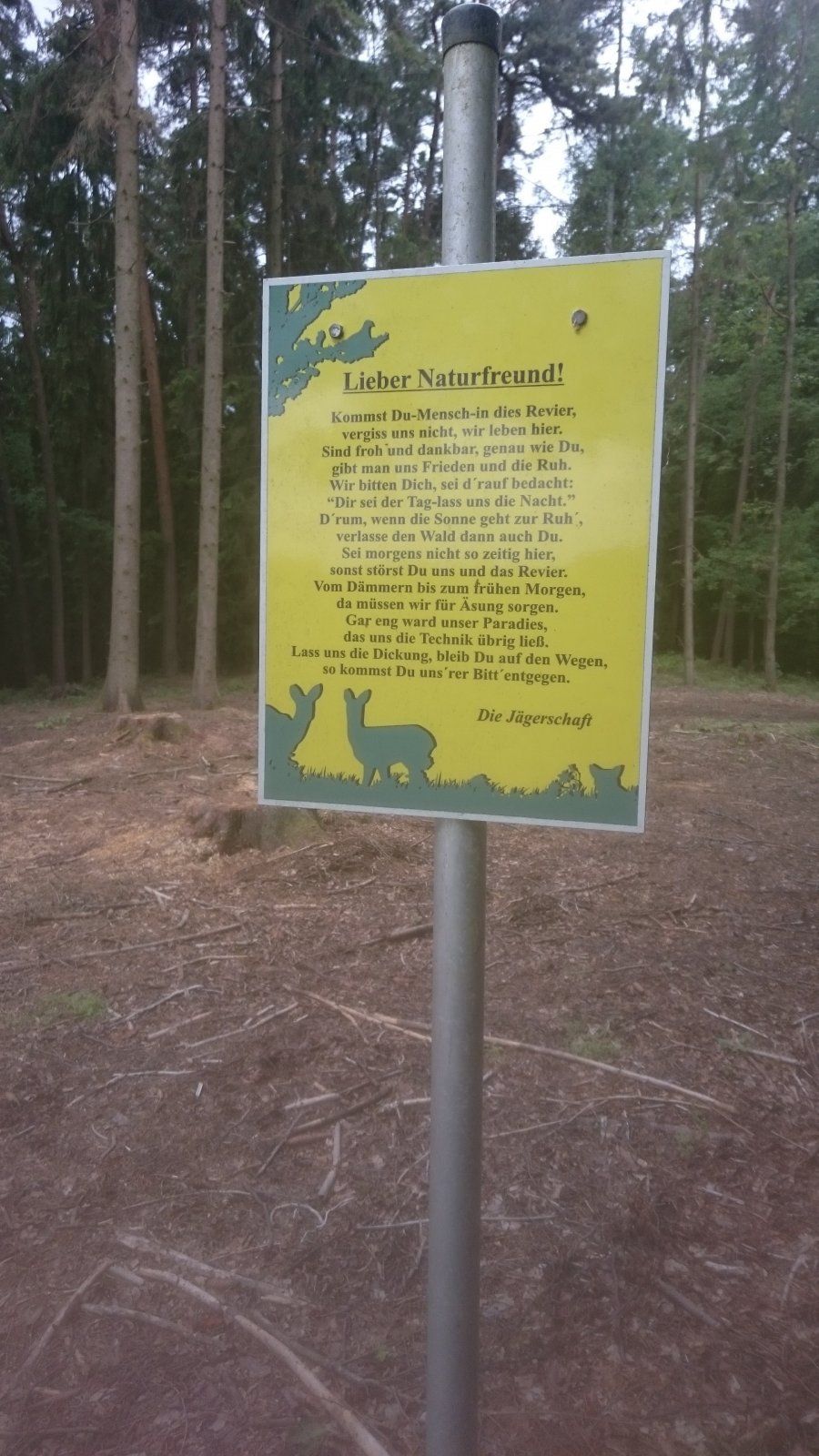 ... die hier ein Schild einbetoniert und Bäume gefällt hat, um Kirrungen anzulegen
