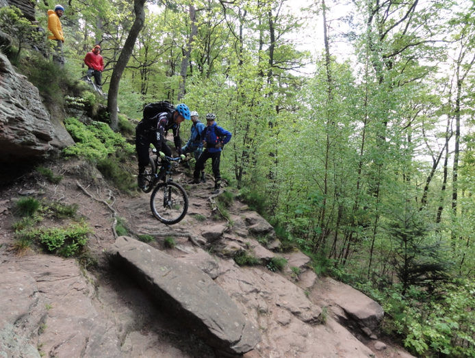 Der Rehfelsen über Elmstein. Leider ist die direkt darauf thronende Schutzhütte wegen Baufälligkeit gesperrt. Und der obere Teil des von der "Mirabellenbank" kommenden Pfades ist nur was für Brombeer-Stachel-Gestrüpp-Masochisten. Die Fahrt vom Felsen runter dürfte den Technikern Spaß machen.