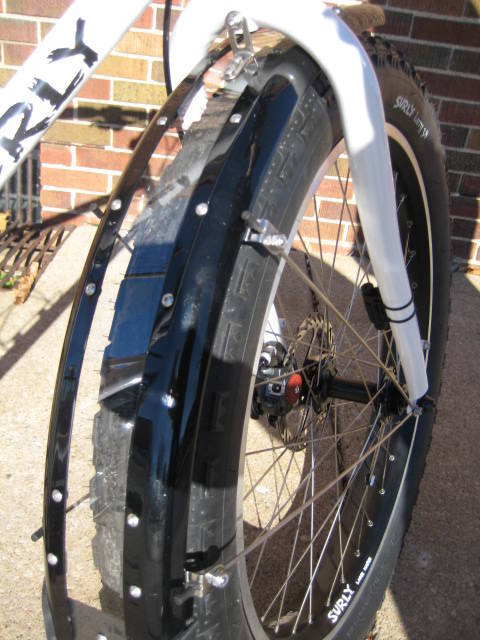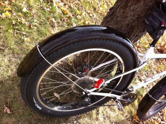 - mit dem 5er Holzbohrer Löcher für die Kabelbinder reingebohrt: an den Flügelchen rechts und links je zwei, und in der Mitte bei ca. 8 cm (Breite) vom Rand aus gemessen nochmal rechts und links je zwei Löcher. So lässt sich das "Schutzblech" an der Fatty Gabel mit 4 Kabelbindern optimal befestigen. Fühlt sich zumindest beim dran Wackeln bombenstabil an. Wie es an anderen Gabeln gut geht müsste man halt probieren.