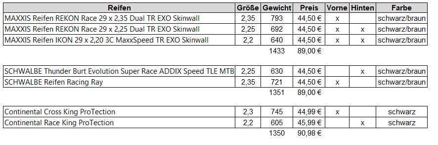 Folgende Reifen stehen zur Auswahl. Die Frage ist nun - welcher passt zu mir? Ich fahre überwiegend Marathons. Brauche also einen schnellen und leichten Reifen, der auch eine gewissen Pannensicherheit mit sich bringt. Dann stellt sich noch die Frage - welcher Reifen für vorne und welcher für hinten? Gerade die Größe ist für mich noch nicht klar, ob ich vorne 2,35 fahre und hinten 2,2 oder umgekehrt oder beide 2,35 oder beide 2,22???