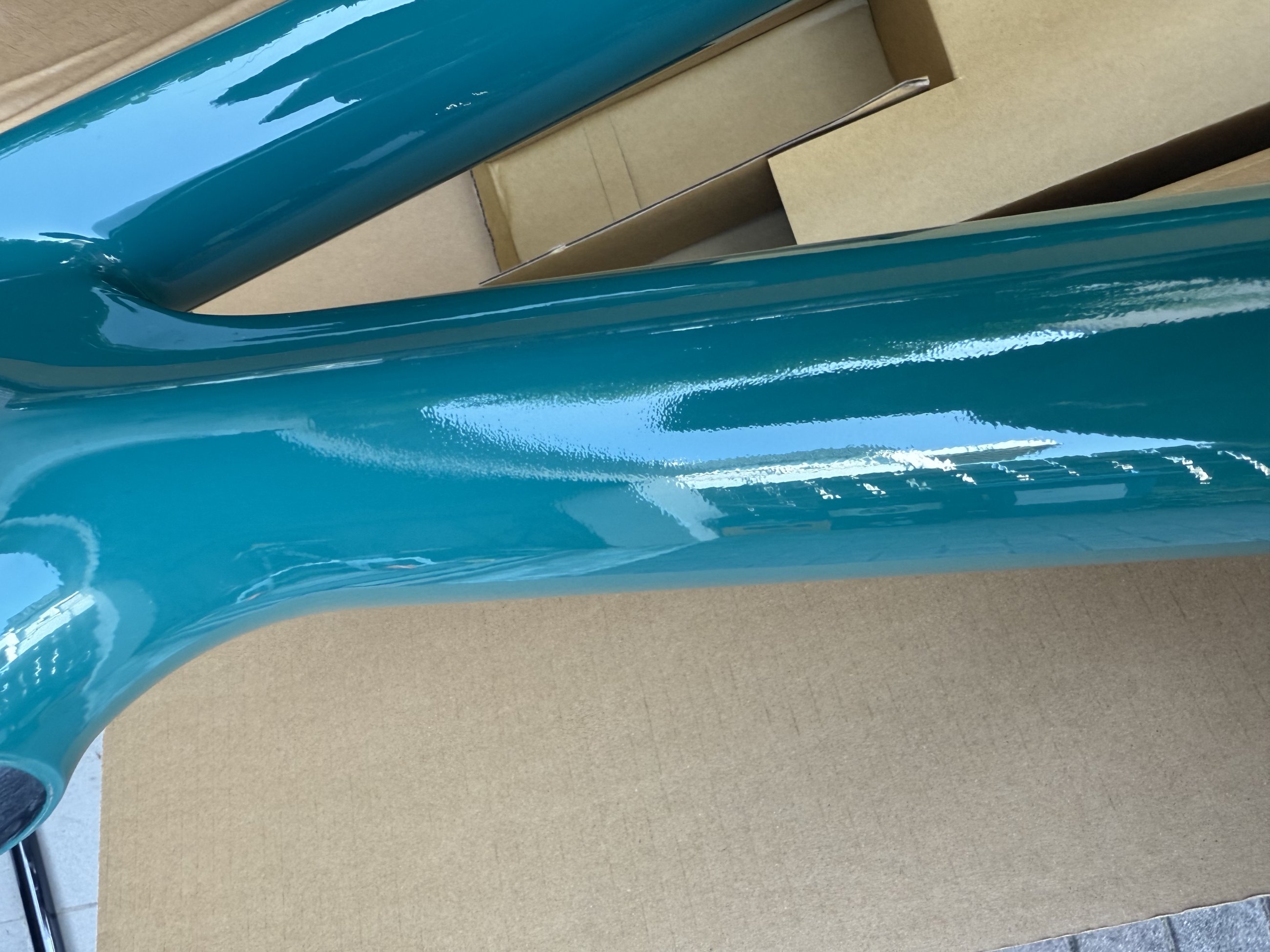 Mein 4060ST Rahmen is auch gekommen. Nur is leider Öl beim Dämpfer ausgelaufen und der Rahmen hat viele Stellen mit Orangenhaut im Klarlack: