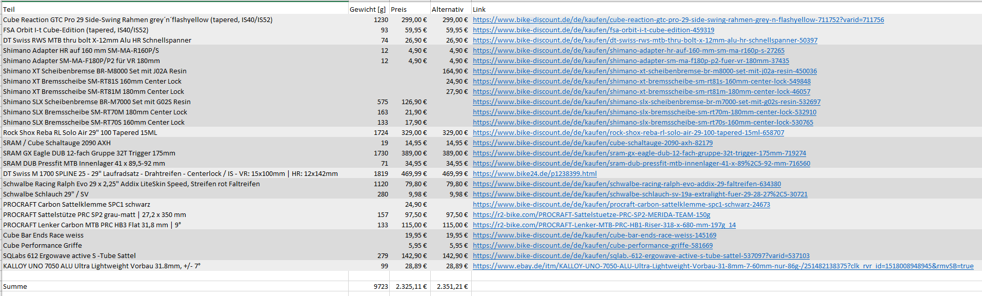 so bin jetzt nochmal 1x11 und 1x12 gefahren und habe mich für die 1x12 entschieden. Die aktuelle Liste habe ich nochmal angehängt. Bin jetzt bei ca. 2300 Euro und ca. 10KG.