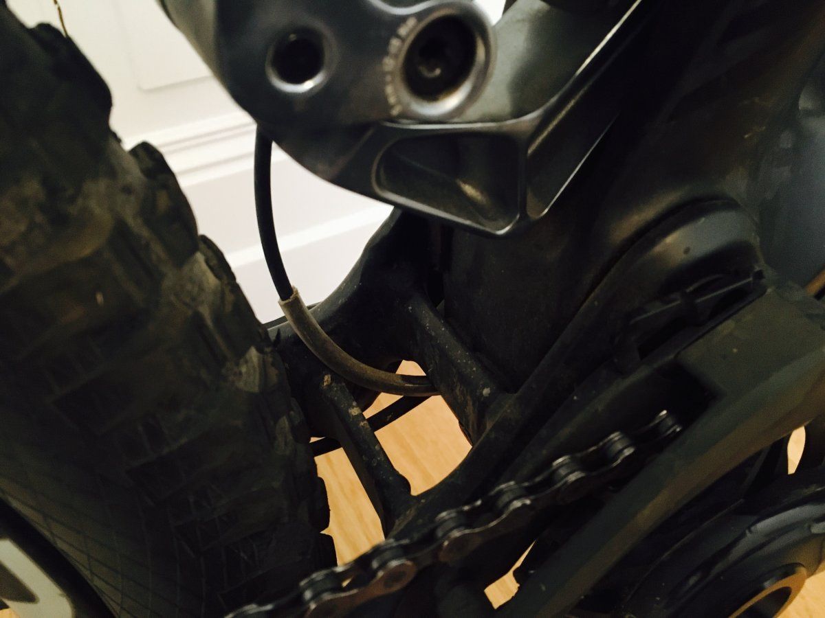 Nee, der Zug liegt gut geführt zwischen den beiden Hinterbau-Querstreben und dann am Dämpfer vorbei unten in das bestehende Loch ins Sitzrohr. Auch bei vollem Einfedern kommt der Zug nirgends in die Quere, weder am reifen noch irgendwo anders. Trotzdem habe ich den Zug an zwei Stellen mit weichem Silikonschlauch überzogen, und am Dämpfer nen Stück Filz aufgeklebt.
