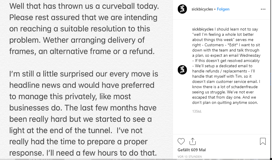 Und die kleine übliche Flucht in die Opferrolle ist auch wieder dabei. - Erst waren es die nervigen Kunden, die nicht länger warten wollten, die Bösen - jetzt sind es die Rahmenbauer und zusätzlich auch noch die Online-Mags.