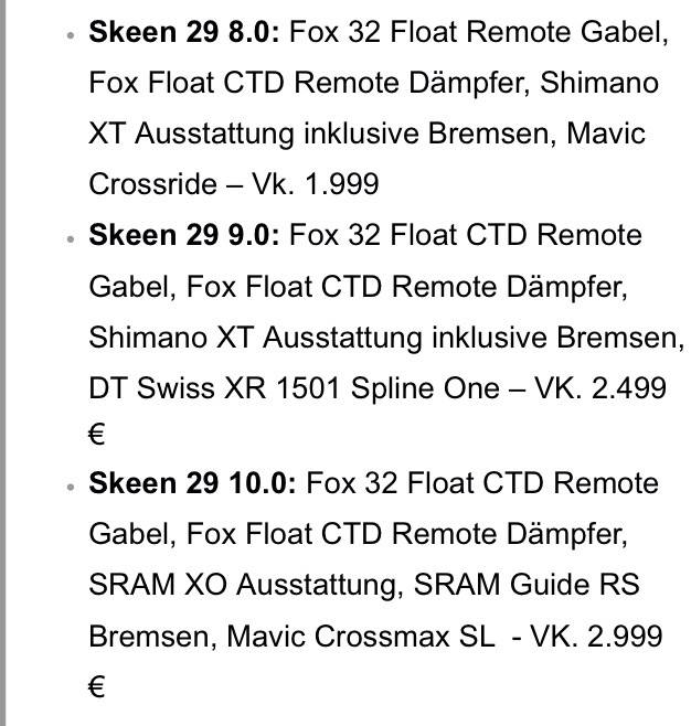 2. Ich halte das Skeen (ich hatte das 9.0) für ein wirklich gutes Rad. Das sehen offensichtlich viele andere auch so. Auf dem Gebrauchtmarkt findest du so gut wie keine Skeens. Entweder werden die Bikes nicht verkauft (was ich mir nicht vorstellen kann) oder die Fahrer sind alle zufrieden mit ihren Bikes... ich vermute letzteres.