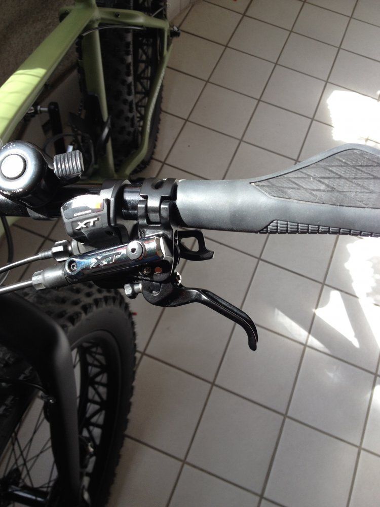 Wenn ich außen am Lenker anfasse, erreiche ich nur mit nach innen gebogenem Zeigefinger den Bremshebel. Fass ich über die GS, schalte ich versehentlich beim anreißen. Geht auf Dauer im anspruchsvollen Gelände nich, müssen Trigger und anständige Griffe dran.