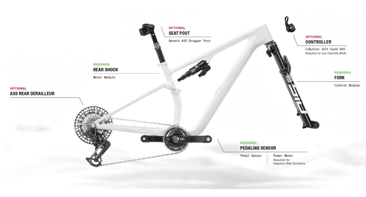 Immerhin ist hier mehr passiert als bei den andren AXS Komponenten wie Schaltung oder Dropper.Man nehme einen Dämpfer entfernt den Hand-Remote , und setzt ein Servo drauf , welcher dann die Arbeit des Hand-Remote übernimmt . Einfach erklärt.