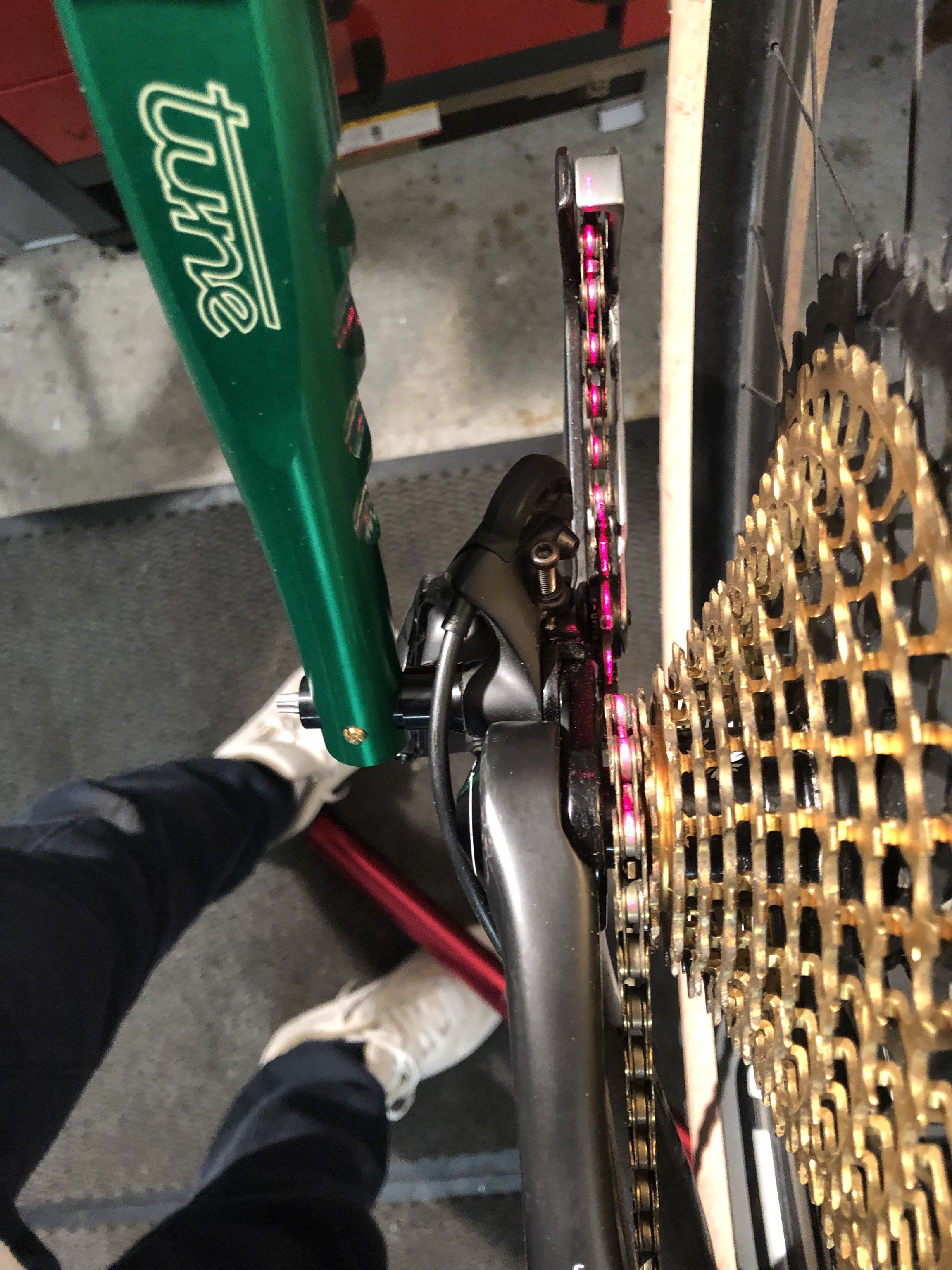 Diejenigen, die nicht soviel für das Lasertool ausgeben wollen nehmen einen Schraubendreher der in die Laschen passt, legt ihn hinein und dreht das Kettenblatt zur Schaltrolle ;-)
