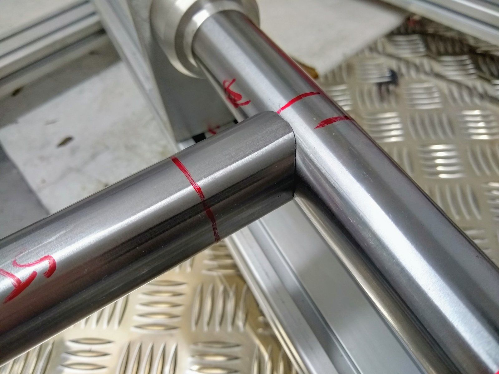 Ein kleines Malheur hat es dann doch noch gegeben: Zum besseren Abführen der Wärme an den Schweißstellen habe ich Einsätze aus Alu gedreht, nur leider mit viel zu kleinem Passungsspiel... Wie ich halt so bin einfach drauf losgeschweißt und dann wie der Hinterbau fertig war gemerkt dass die Teile nicht mehr raus gehen 🙈💩 0,2 mm Spiel im Durchmesser war dann doch eher gut gemeint. Naja die Heatsink am Tretlager habe ich schön aufgebohrt und rausgezogen, oben am Sattelrohr keine Chance. Flex angesetzt, Sitzstreben und Sattelrohr rausgetrennt und eine Woche auf die Lieferung gewartet. Beim zweiten Anlauf mit viel mehr Spiel für die Einsätze ging dann alles gut. Bilder sagen mehr als Worte: