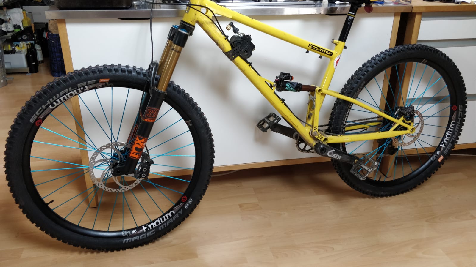 das gelbe Murmur... hatte im Herbst neue Füsse bekommen, I9 mit blauen Speichen (ziemlich genau die Farbe der Fox Einsteller).