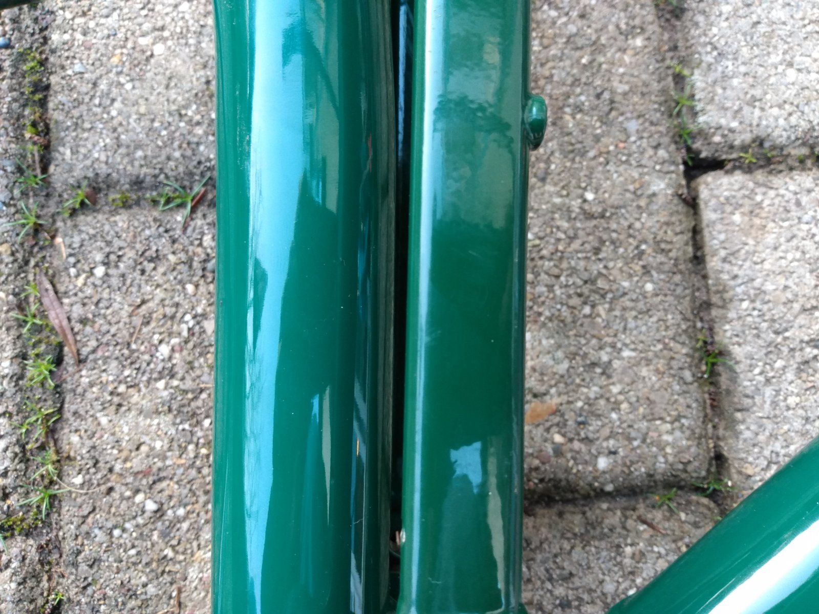 Hier mal ein Versuch den Farbunterschied auf ein Foto zu bannen. Live ist der Unterschied aber noch etwas deutlicher. Ich habe mich jetzt aber entschieden das als Ganze sozusagen als Alleinstellungsmerkmal zu sehen und den Bock einfach wieder aufzubauen. Wenn man nicht direkt darauf achtet, fällt es denke ich im aufgebauten Zustand auch kaum auf. Außerdem ist das Ding ist ja schließlich zum Fahren und nicht nur zum Anschauen da. Wenn der Rahmen mit den neunen Modifikationen jetzt wie versprochen ewig hält, muss ich ihn ja sowieso früher oder später neu lackieren