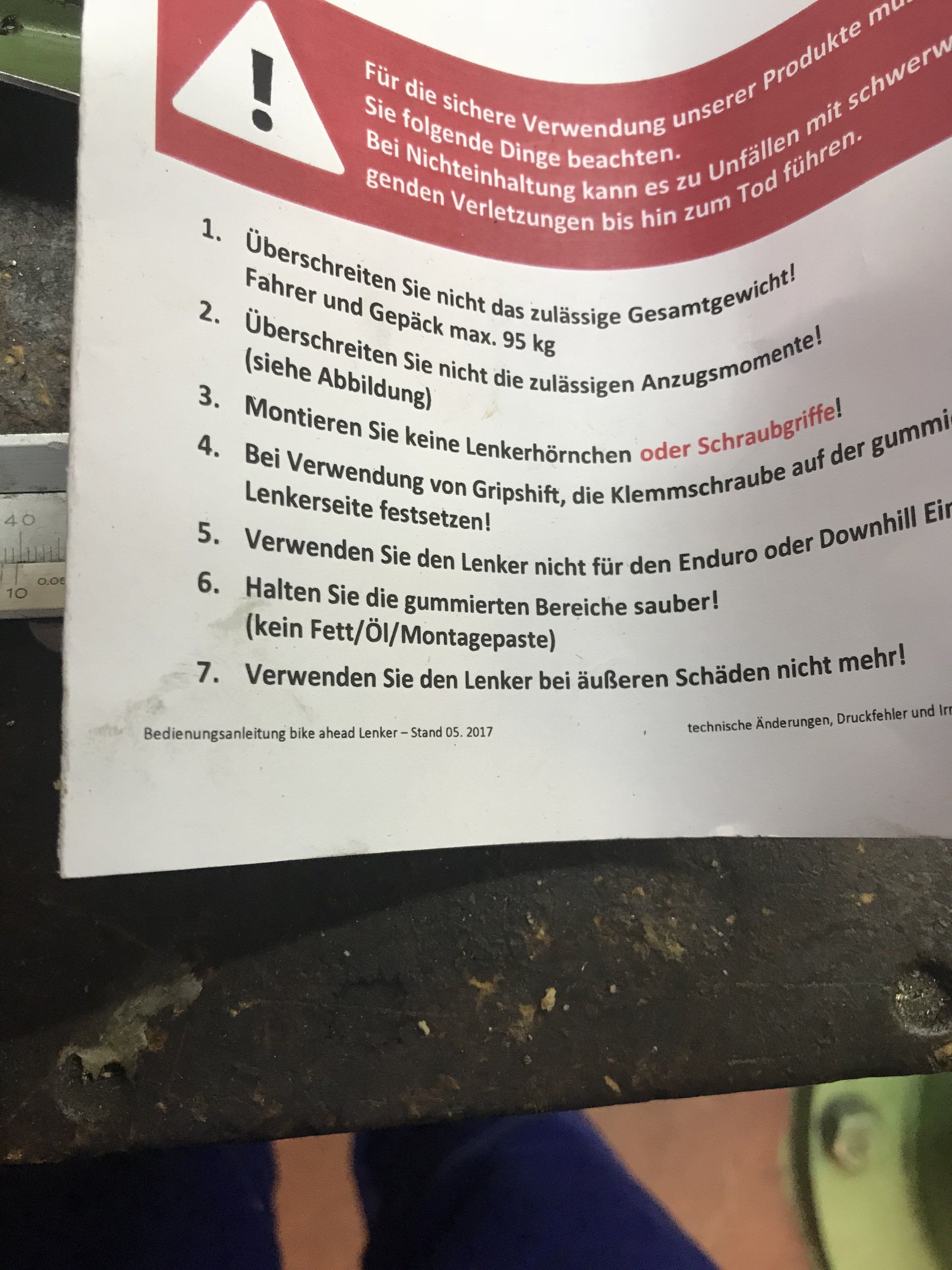 Soviel zum Lenker, laut meiner Anleitung Keine schraubgriffe erlaubt