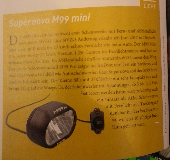 - ich habe mir nun, nachdem ich verschiedene andere Scheinwerfer probiert habe, die M99 Pro gekauft. Und siehe da, das Ding funktioniert nicht - an einem normalen Akku!! (obwohl ich von Supernova Anfang des Jahres eine anders lautende Info bekommen habe). Es braucht eben doch diesen blöden Canbus ..... da ich kein Bosch fahre, habe ich nix Canbus. Sehr enttäuschend. Jetzt muss ich das Teil doch wieder zurückschicken... Wenns ja eine alternative gäbe?! Am Selbstbau auf Basis von Luxos habe ich mir auch die Zähne ausgebissen.Der jetzige Support Mitarbeiter war auch entsetzt über die Falsch-Info, die ich anscheinend bekommen habe...Das ist schade. Wusste der Mitarbeiter es nicht besser?