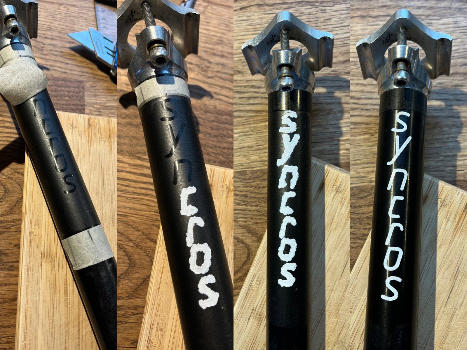 Bei mir gings heut auch weiter mit Syncros Sachen.Hier ein erster Versuch sich um die uncoolen sehr weit verbreiteten Decal Aufkleber auf Syncros Stützen drücken.