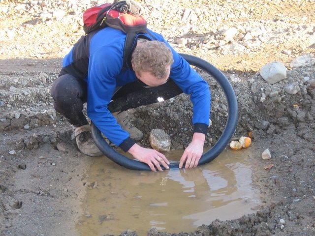 So langsam neigte sich der Tag dem Ende zu und der Guide mahnte zur Eile. Schliesslich sollte der Felsentrail noch bei Tageslicht befahren werden. Aber nee, just zu diesem Zeitpunkt musste der Eingangs erwähnte Herr U.W. wieder eine Panne vortäuschen. Sein Bruder T.W übte sich dann in orthodoxen Schlauchdiagnosemethoden, die aber eine Beschleunigung der Problembewältigung nicht nachhaltig erreichen konnten.