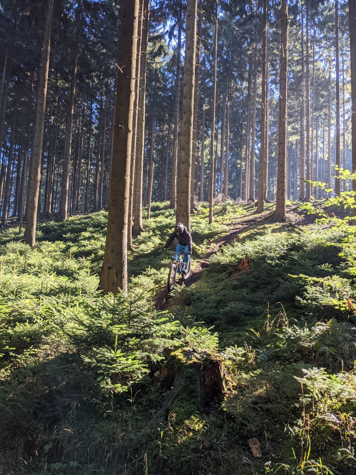 Ich bin aber fast sicher, dass das kurz vorm Ausstieg des letzten Teils der "unrichtigen wirklich sehr kleinen Zahl" ist. Der erste/mittlere Teil von besagtem Trail endet ja kurz nach einer Brachfläche, wo ein witziges sich selbst widersprechendes Schild steht (hab den Wortlaut gerade nicht im Kopf) auf einem alten Wirtschaftsweg und man kann entweder nach links wegfahren und die restlichen Tiefenmeter per Forstweg machen, oder nach rechts, und dann nach einem kurzen Stück Wirtschaftsweg geht es links durchs Gebüsch in den letzten Teil rein, erst flowig-schnell, und dann kommt eben diese Stelle auf dem Foto. Direkt danach landet man auf einem Forstweg und fährt nach rechts Richtung Uphill Forsthaus->Krause Eiche->Kammweg Dörenberg/Grafensundern zurück und kann bei Bedarf noch eine kleine "Bachdurchfahrt" mitnehmen und auf der anderen Seite zum Uphill fahren. Und ich denke, der Fotograf stand unten auf dem Forstweg und hat da eben hochfotografiert, da macht man sich die Füße nicht dreckig, kann aber Action sehen.