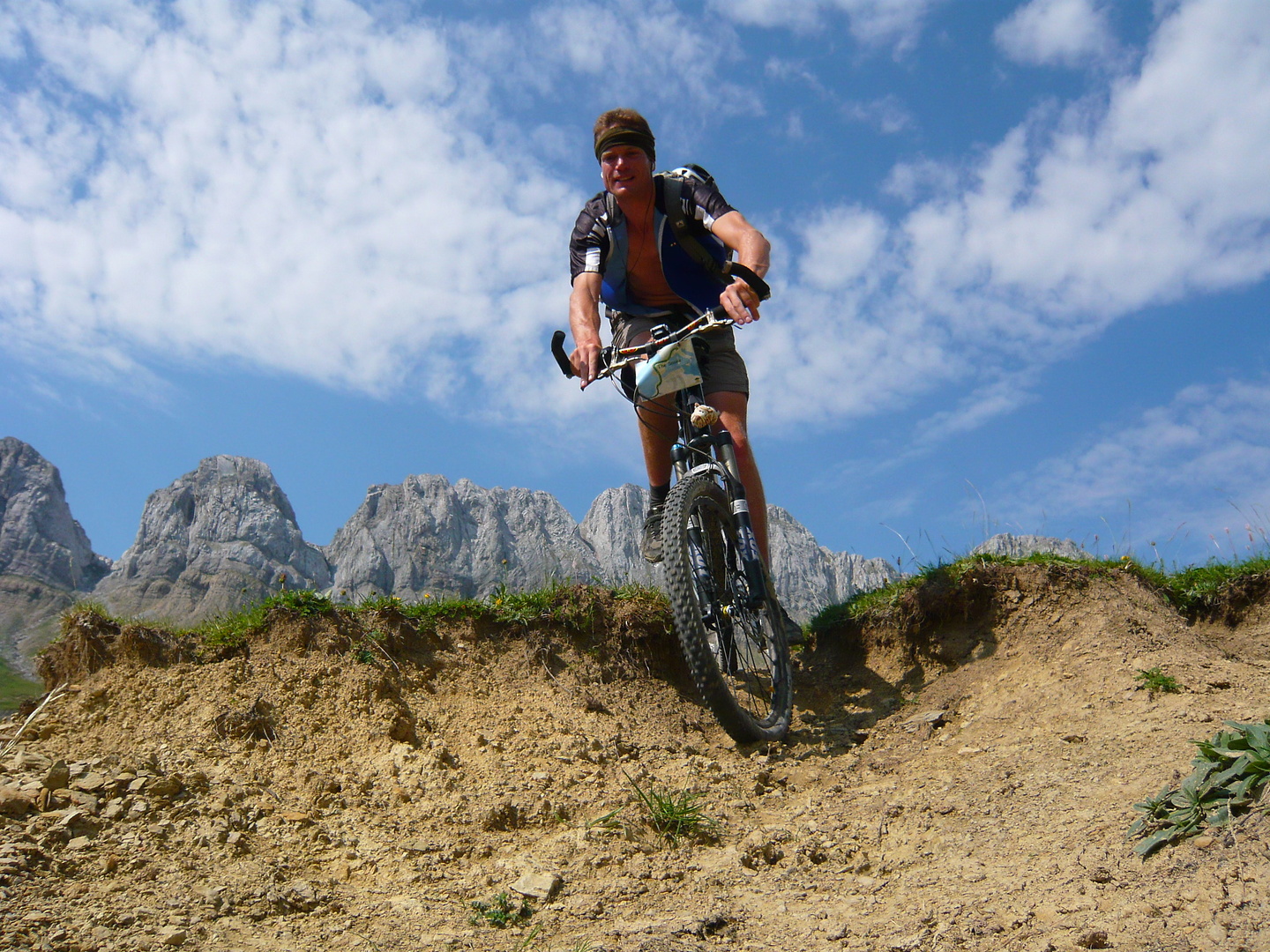 Zwischendurch geht's immer mal wieder ein paar Meter bergab. Die werden benutzt, um das optimale Setup für Gabel, Dämpfer und Zorro zu finden. Schlussendlich erwarte ich oben den ersten richtigen Trail mit dem Spectral, da sollte schon alles passen. Zum Glück hat mir der Technikchef von Canyon gestern noch eine Kurzanleitung gemailt, damit krieg auch ich als Luftgabel-Neuling die Geschichte recht bald in den Griff.