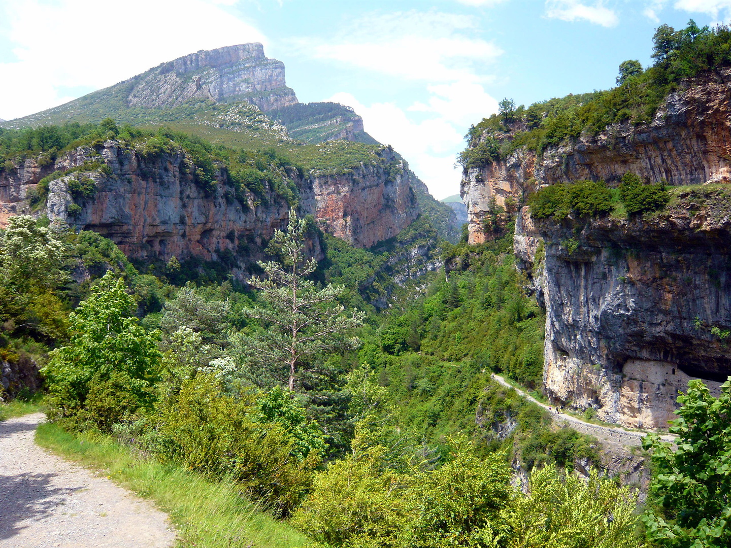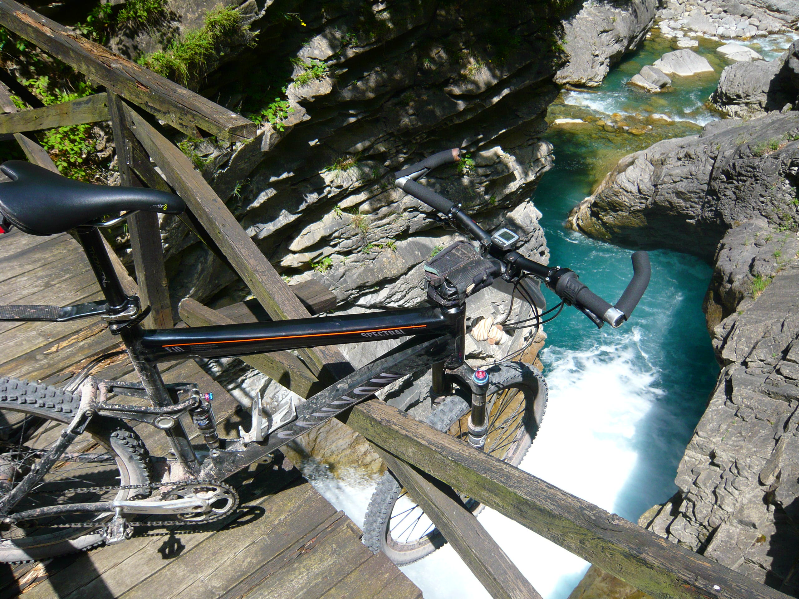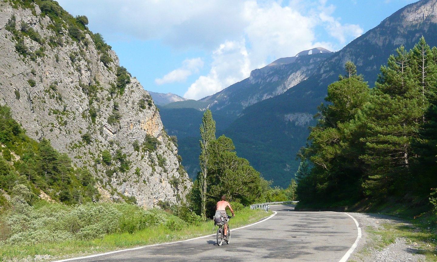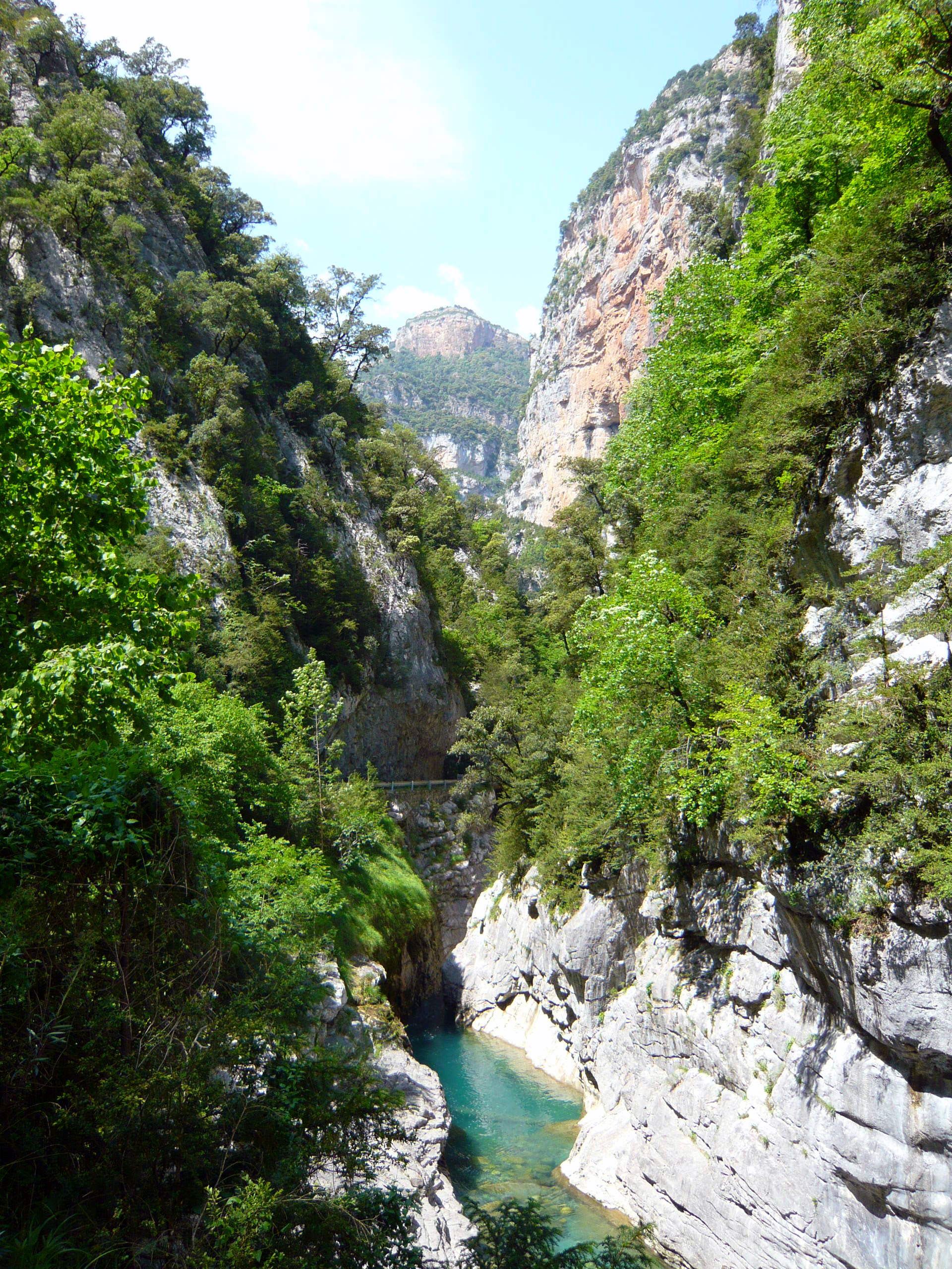 Schon wenige Kilometer hinter dem Ort beginnt die Schlucht der Torla. Eine Piste führt durch den schmalen, tief eingeschnittenen Canyon, immer direkt am Rand des tosenden Bachs. Einige teils steile Höhenmeter sind noch zu überwinden, doch in einer solch faszinierenden Umgebung fällt mir das radln wieder leicht.