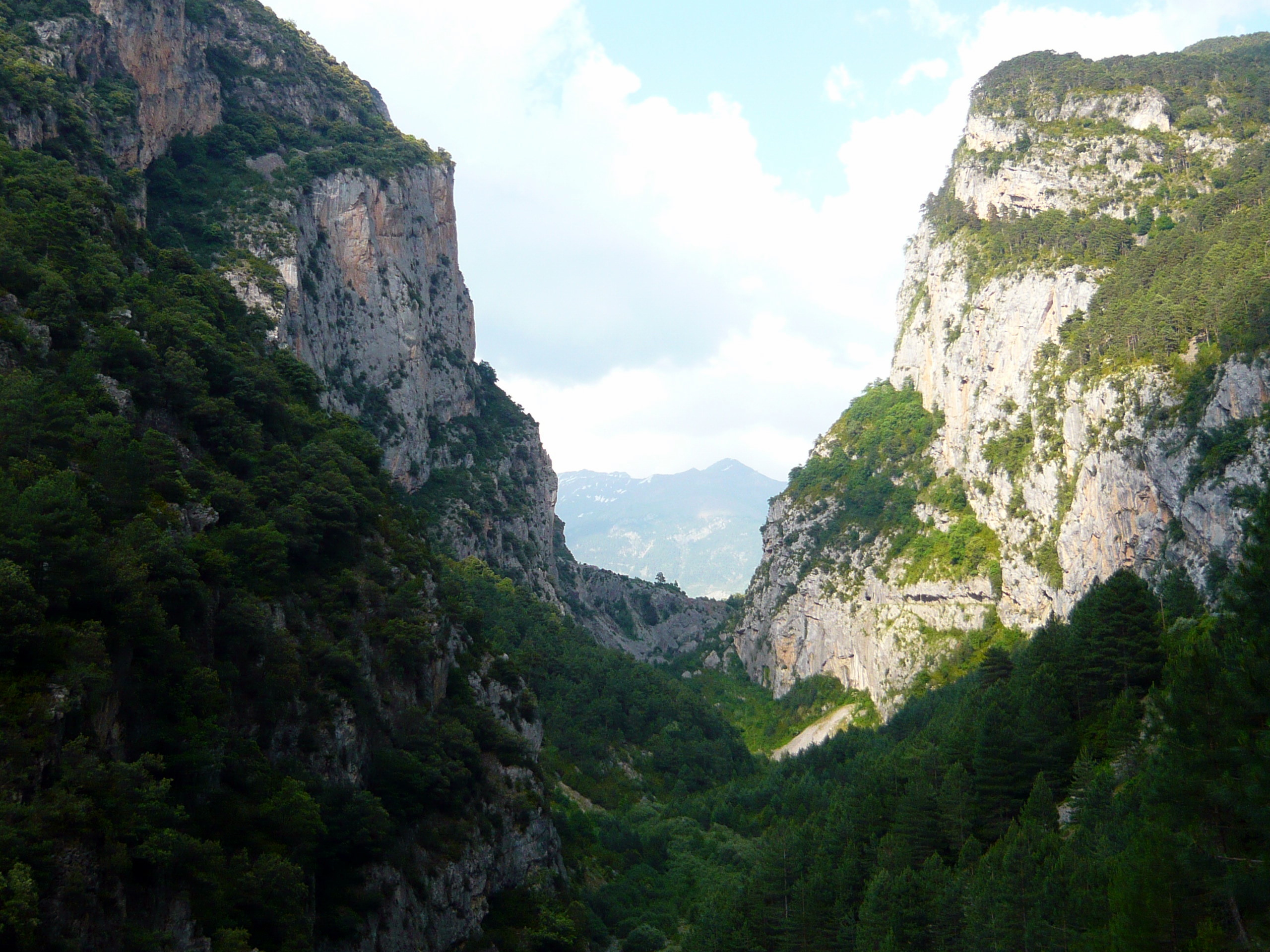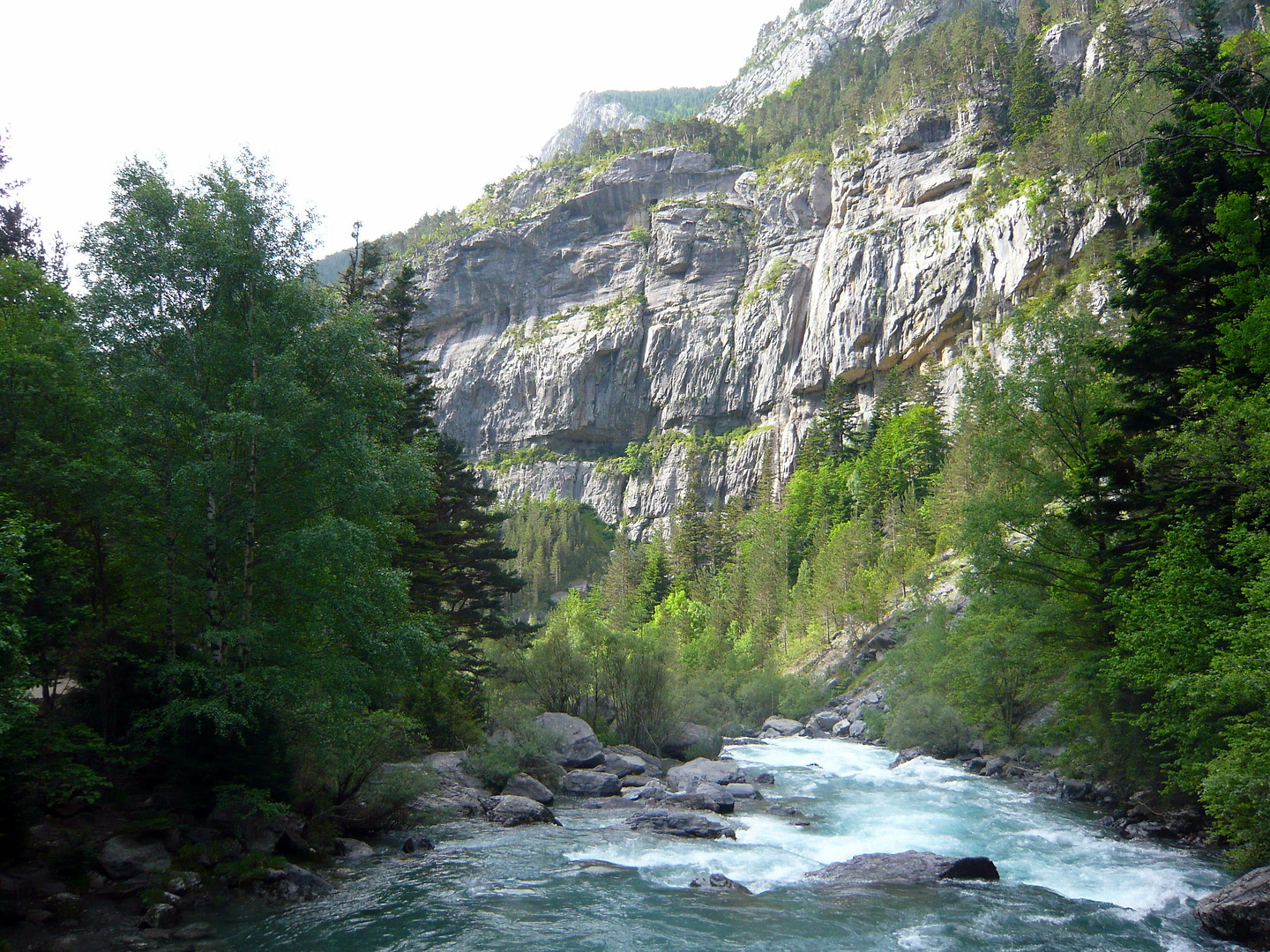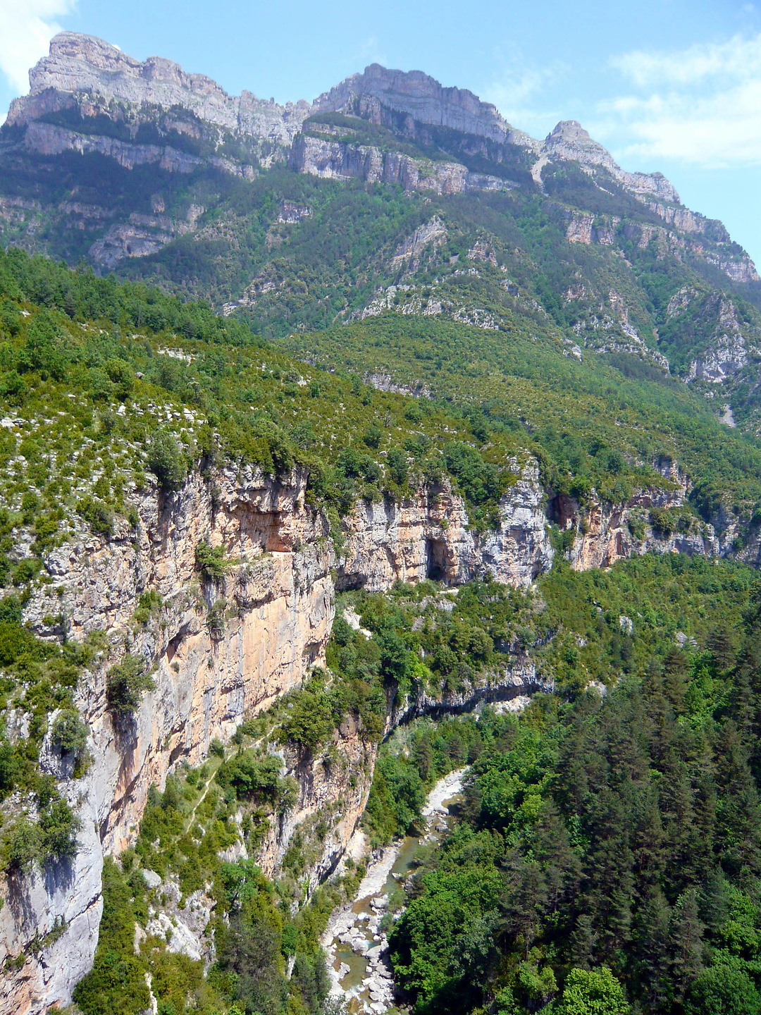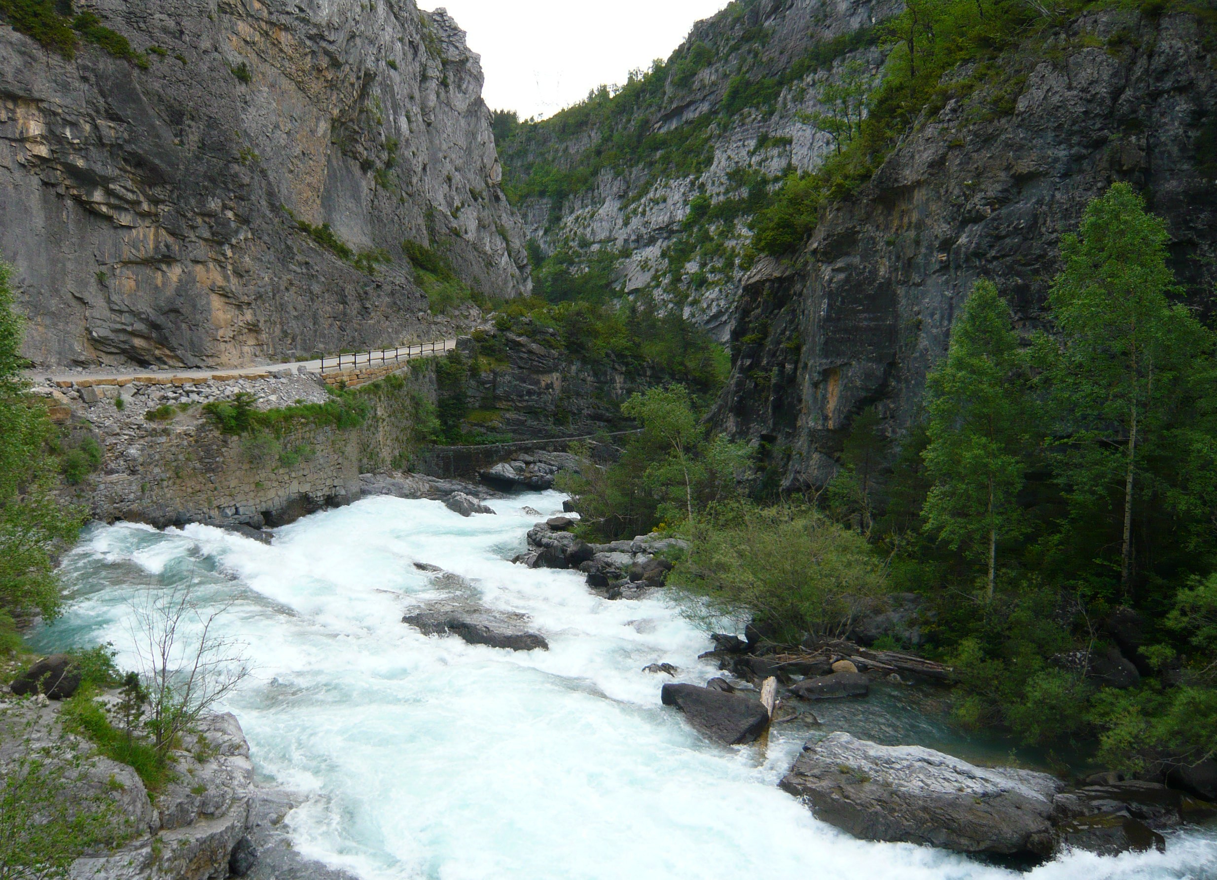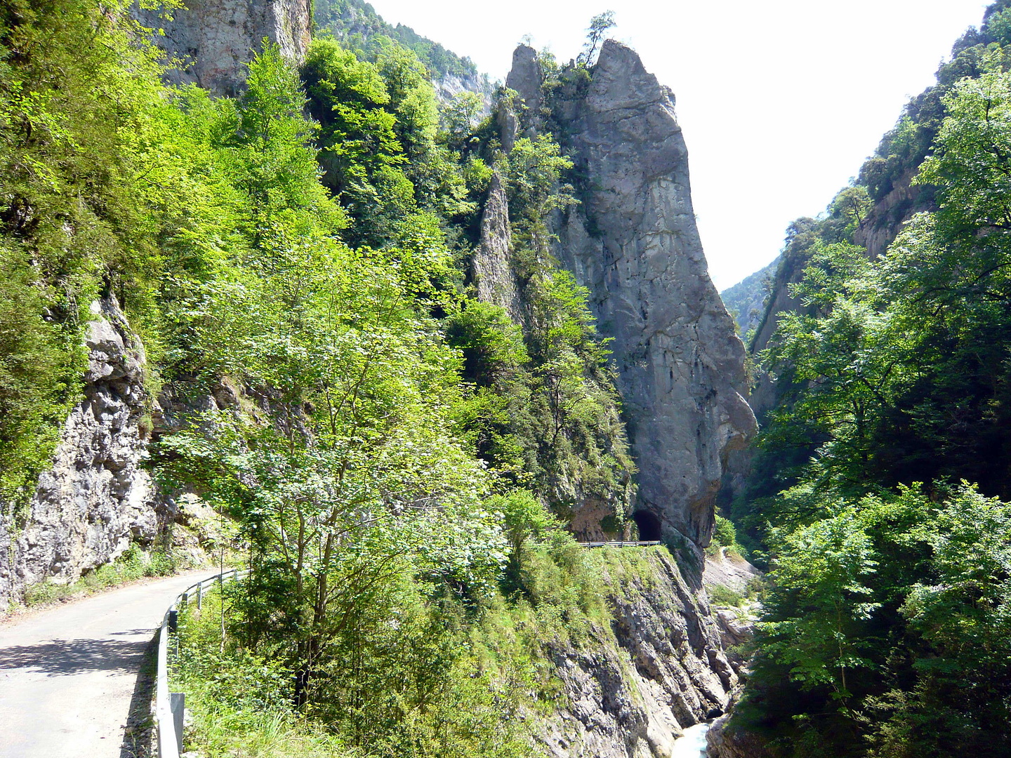 Schon wenige Kilometer hinter dem Ort beginnt die Schlucht der Torla. Eine Piste führt durch den schmalen, tief eingeschnittenen Canyon, immer direkt am Rand des tosenden Bachs. Einige teils steile Höhenmeter sind noch zu überwinden, doch in einer solch faszinierenden Umgebung fällt mir das radln wieder leicht.
