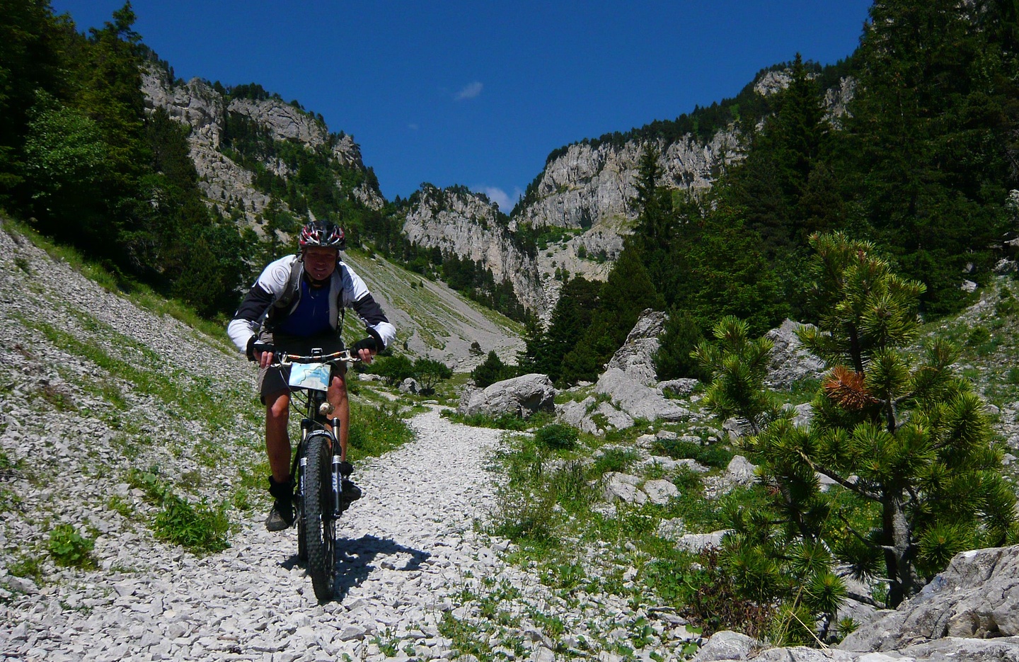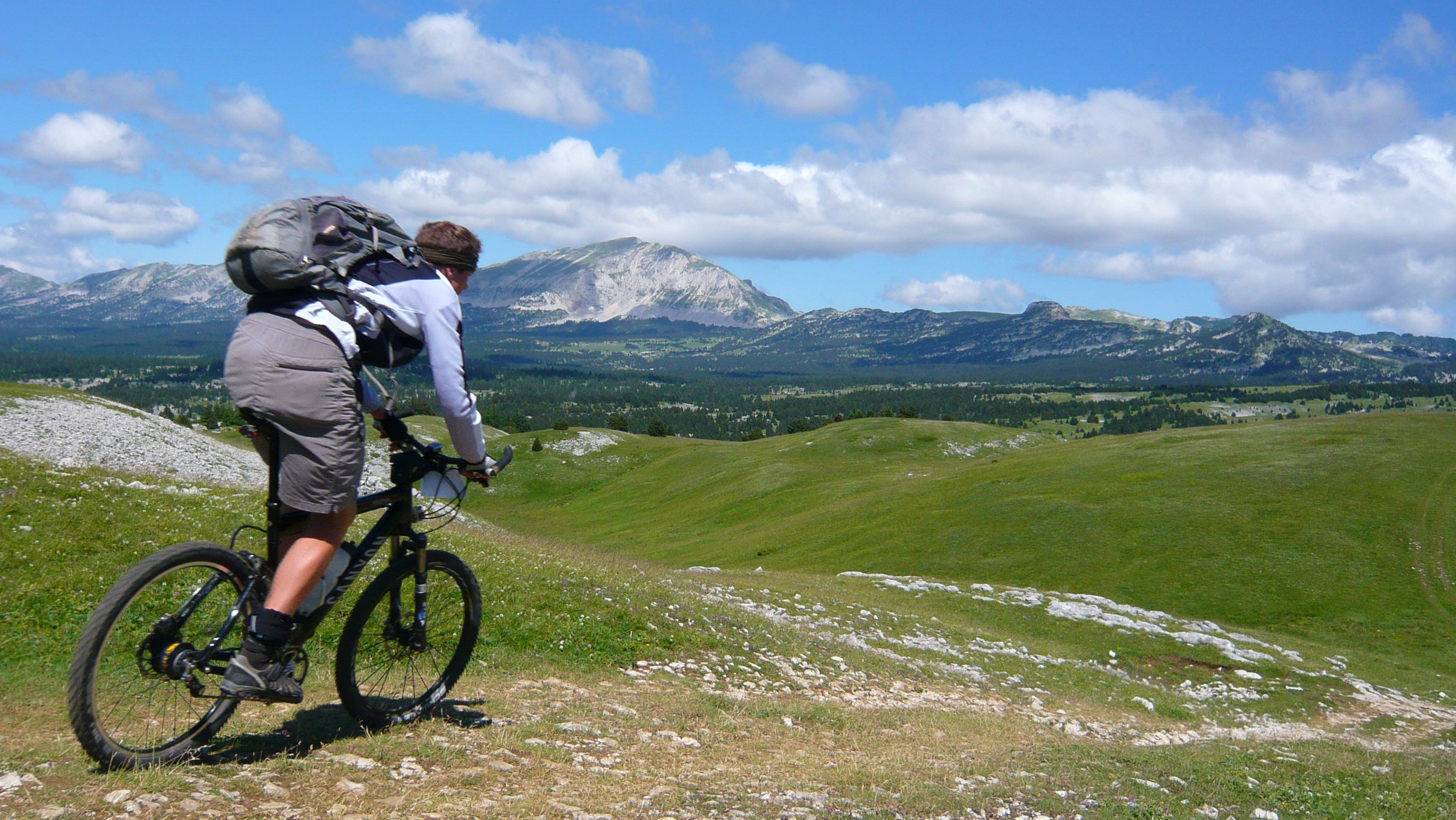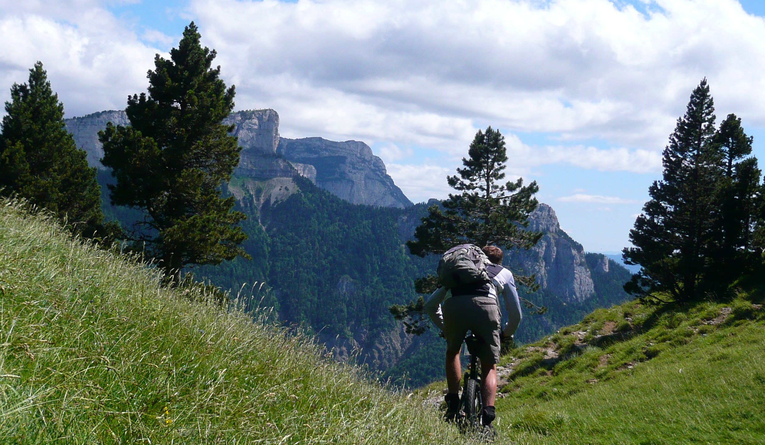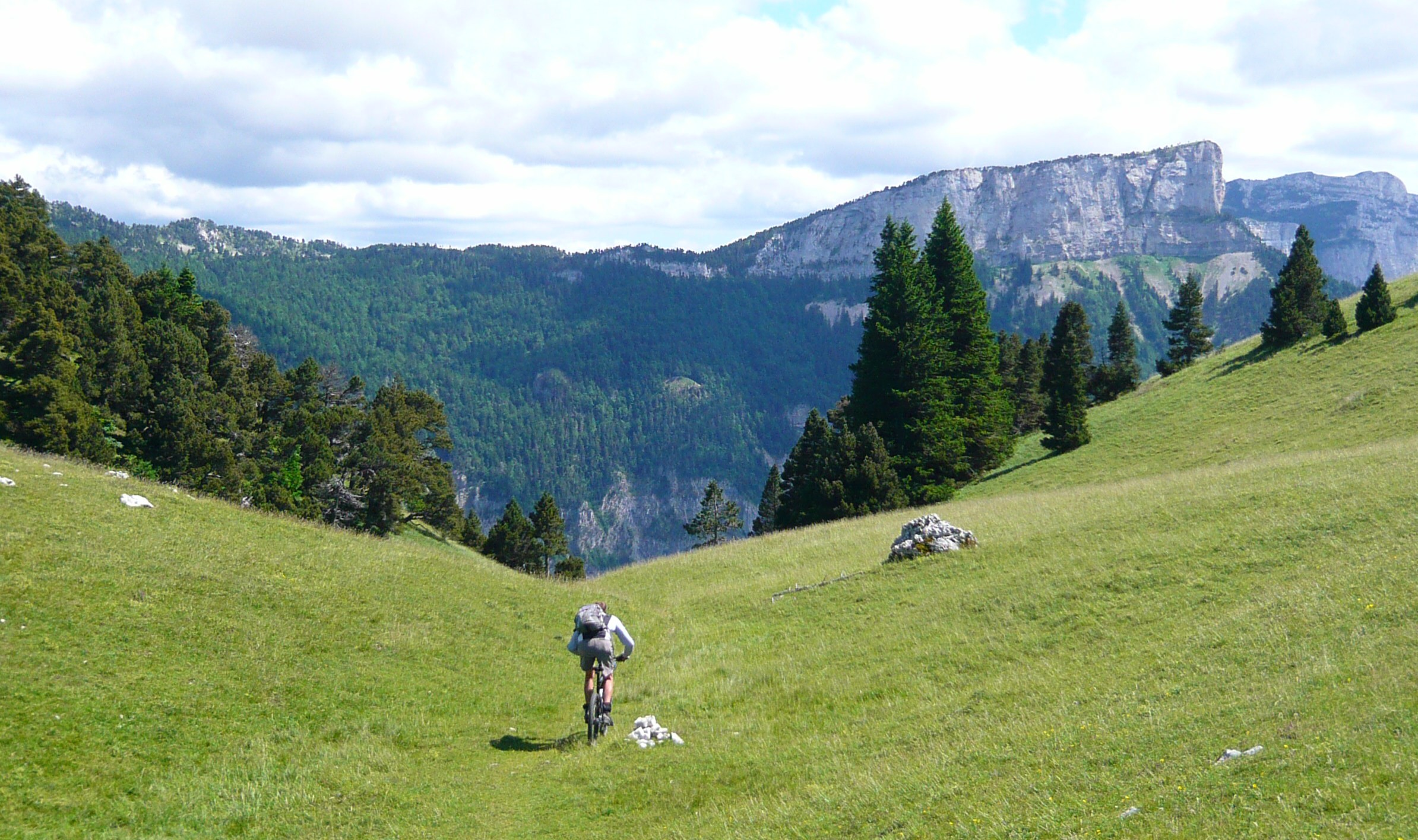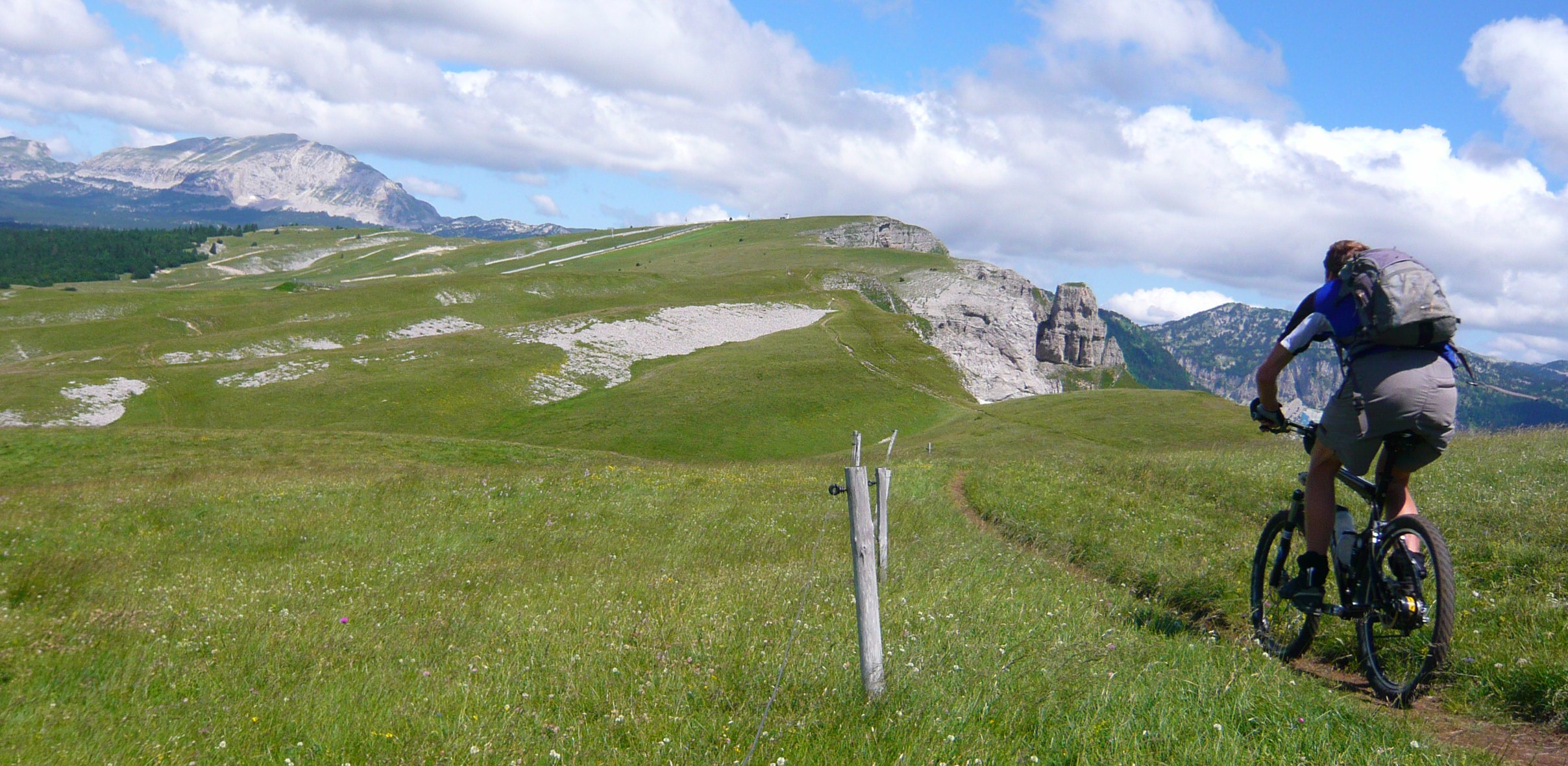 Der Tag beginnt mit 900 Höhenmetern auf einem wunderschönen Pass, der Col de Rousset könnte auch irgendwo in den Dolomiten stehen, nach den Felspanoramen zu urteilen. Allerdings ist er sehr flach, die Franzosen hams da mit den Serpentinen ein bisserl übertrieben find ich. Das freut die Rennradler und fordert hohe Gänge gegen die Langeweile beim Mountainbiker. Früher hab ich zu sowas "mittleres Kettenblatt" gesagt, aber das zieht seit Rohloff irgendwie nimmer.