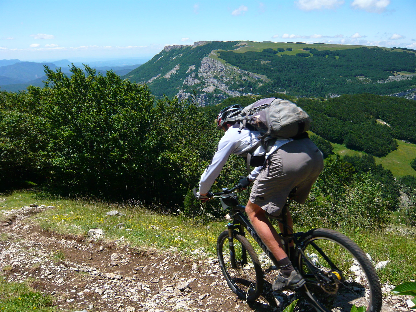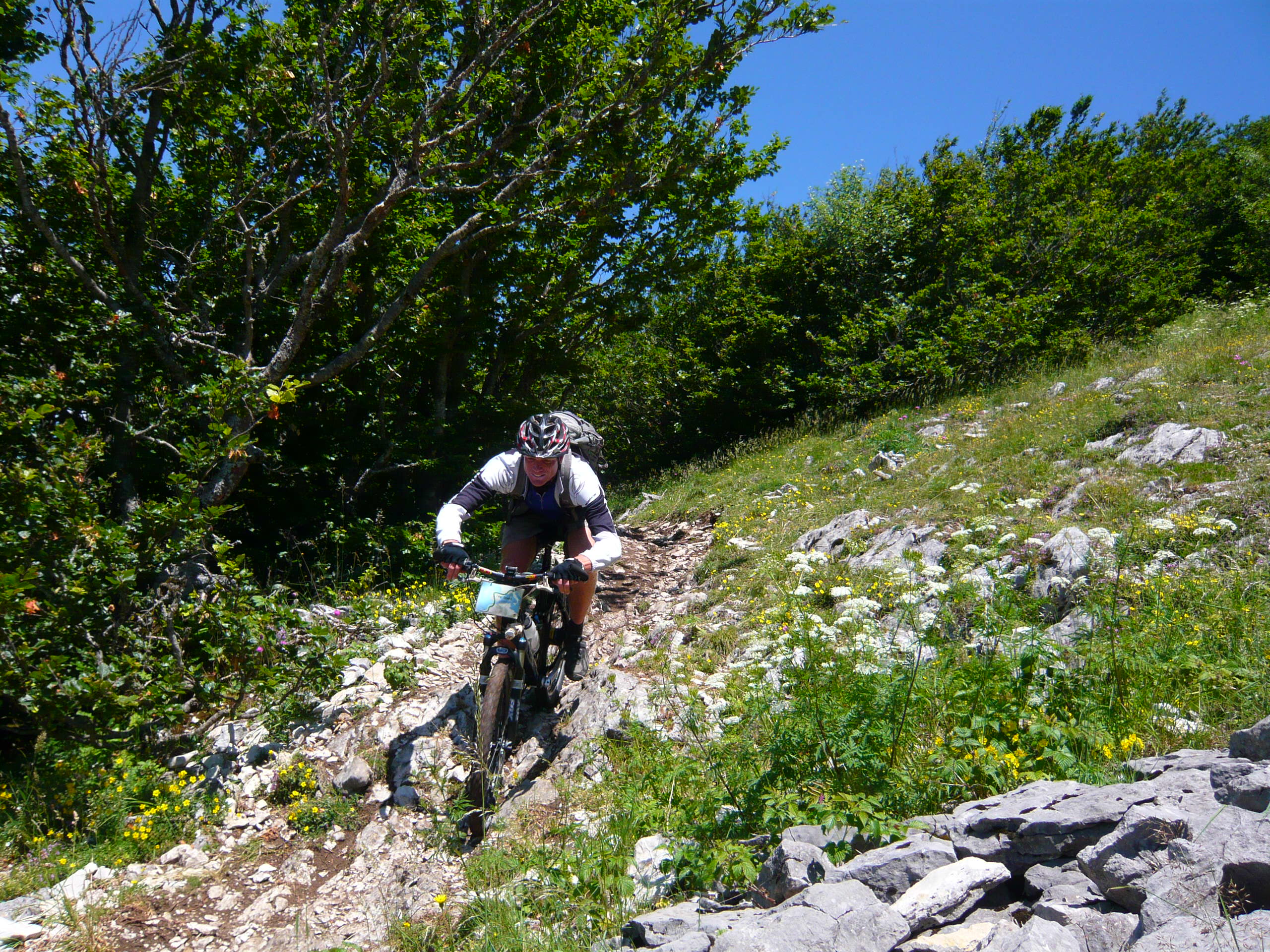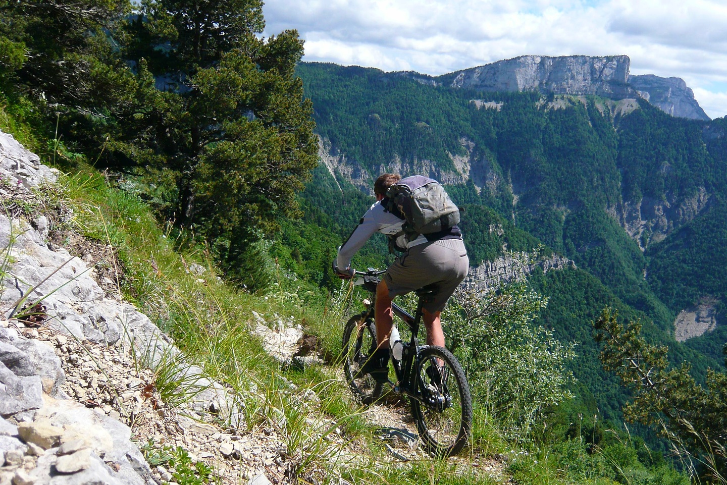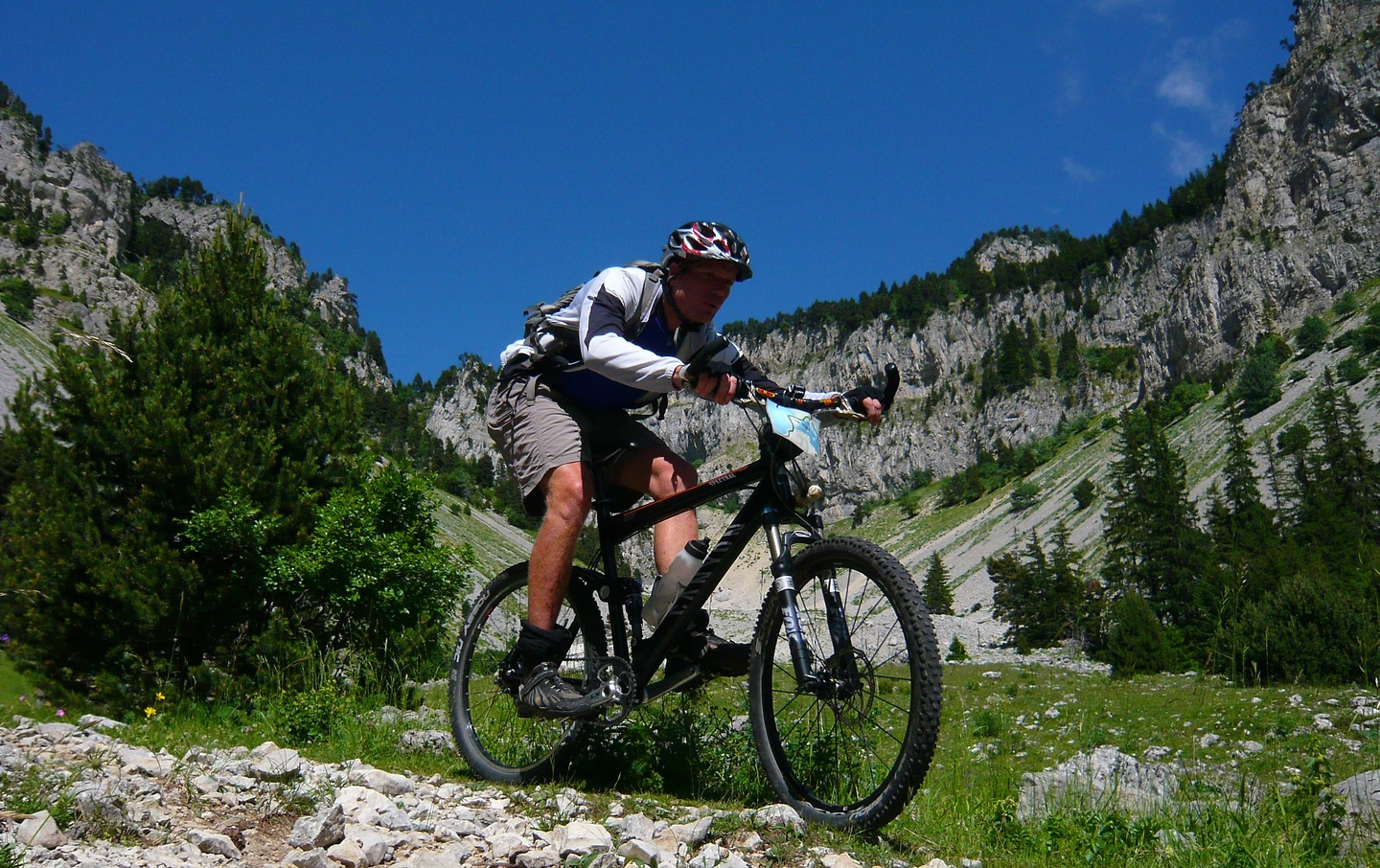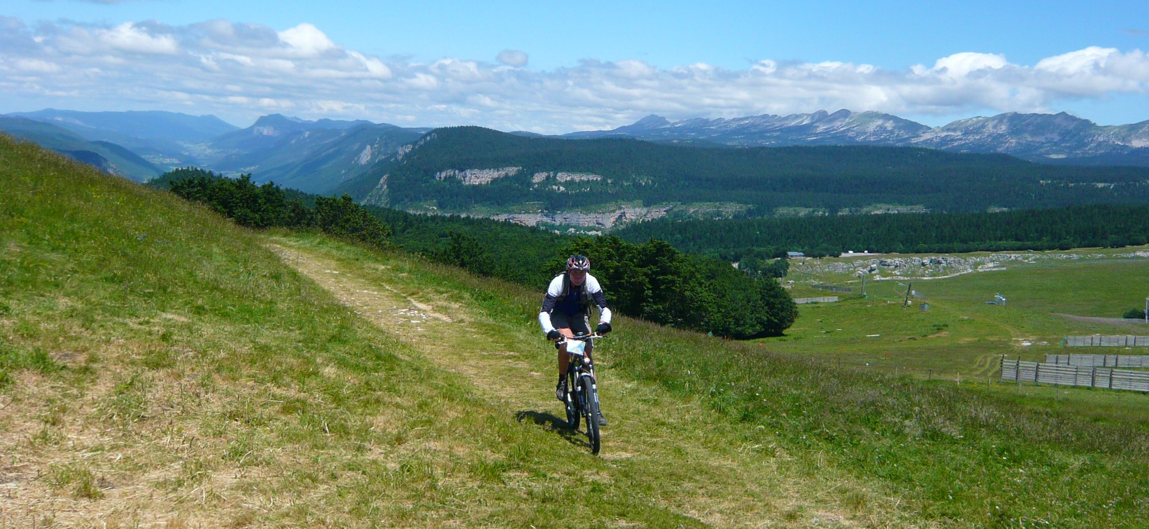 Der Tag beginnt mit 900 Höhenmetern auf einem wunderschönen Pass, der Col de Rousset könnte auch irgendwo in den Dolomiten stehen, nach den Felspanoramen zu urteilen. Allerdings ist er sehr flach, die Franzosen hams da mit den Serpentinen ein bisserl übertrieben find ich. Das freut die Rennradler und fordert hohe Gänge gegen die Langeweile beim Mountainbiker. Früher hab ich zu sowas "mittleres Kettenblatt" gesagt, aber das zieht seit Rohloff irgendwie nimmer.