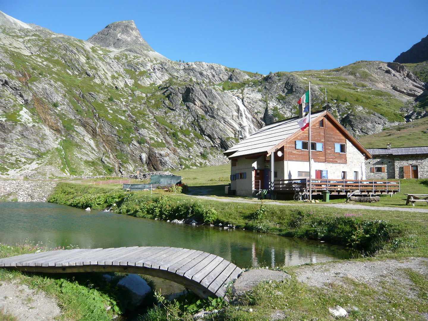 Gibt's was besseres, als nach einem langen Tag an so einem genialen Ort anzukommen? Auf einem ebenen Wiesenstück gelegen, eingebettet zwischen den steilen Felswänden der Aiguille de Scolette (3500m) und der Puenta Sommeiller (3333m) liegt das Alpenvereinshüttlein inmitten zahlreicher Wasserfälle. Bin der einzige Gast heute nacht und werde entsprechend großzügig bekocht. Mal wieder was richtiges mampfen ist auch nett, nach den vielen Supermarkpicknicks der letzten Tage.