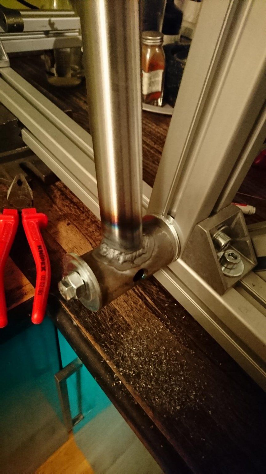 Ähnlich sieht das am Steuerrohr aus. In den Halter habe ich ein Gewinde reingeschnitten. Leider leicht schief. Dadurch sah es auf Fotos so aus als ob das Steuerrohr schief war. Es war ein wenig nervig, da immer nachzujustieren. Da werde ich mir noch was einfallen lassen, dass der Bereich auch zentriert ist.