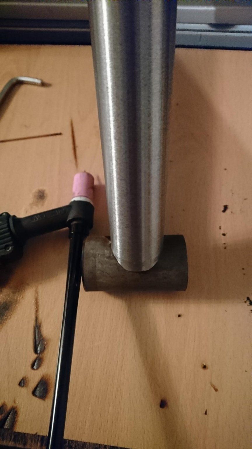 Das klappte von Verbindung zu Verbindung immer besser, bis klein Philipp wieder übermütig wurde. Verbindung Oberrohr und Sitzrohr wurde direkt mit einem Loch Quittiert, weil ich das Materiel nicht weit genug habe abkühlen lassen.