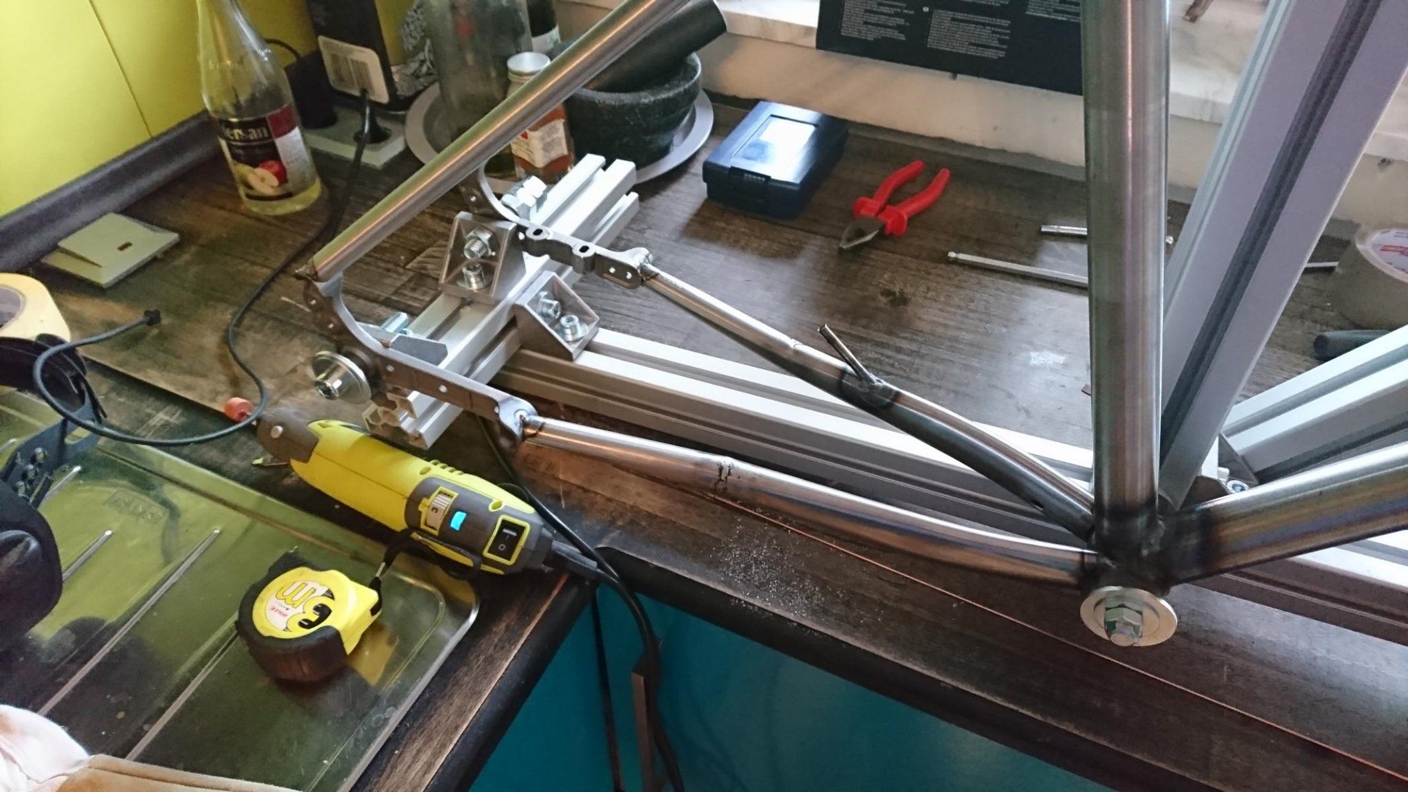 Zur Rahmenlehre: Vom Prinzip her funktioniert sie ganz gut. Einzig das Messen der Geometrie ist nicht ganz einfach. Da werde ich wohl für die Befestigungen noch ein wenig was ändern. Beispielsweise hätte ich das Tretlager gerne fixiert und einen größeren Abstand zur Lehre an sich. Das scheiterte dieses Mal am mageren Schraubensortiment im Bauhaus ( M8 x 200 oder ähnlich bräuchte ich da. Gabs nicht. ), sowie daran, dass ich keinen WIRKLICH parallelen Abstandshalter hatte. Wird geändert, dann passts.
