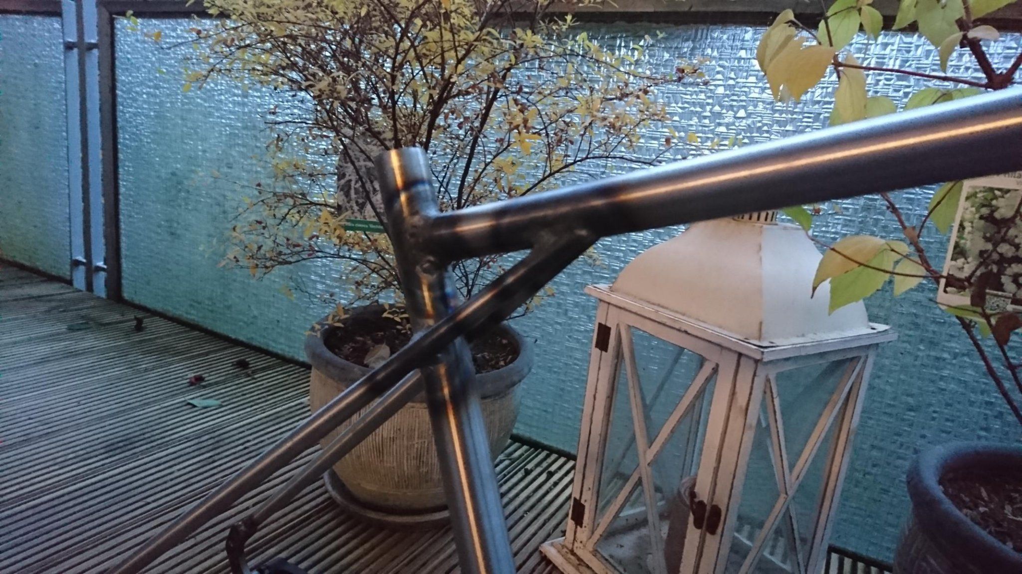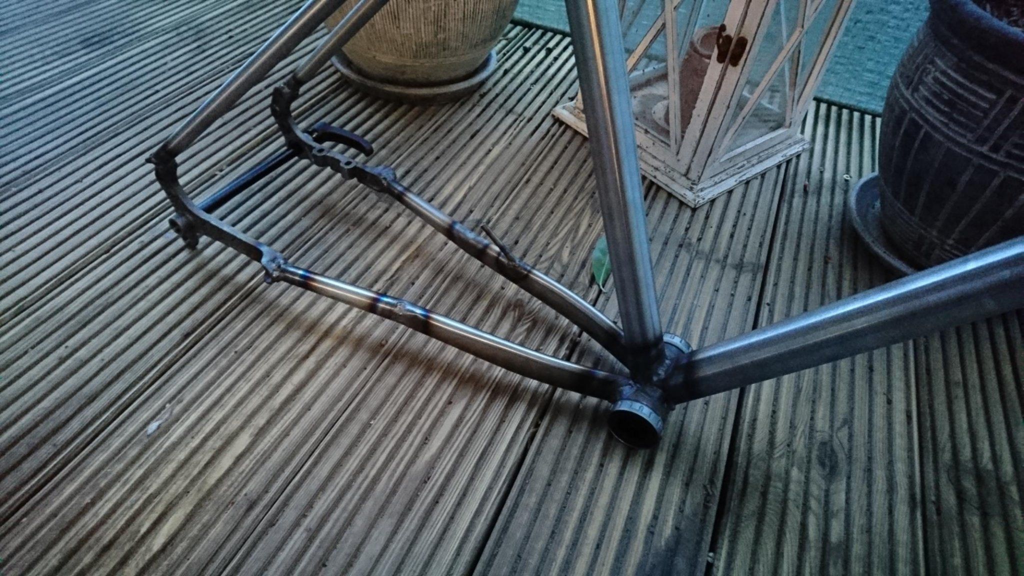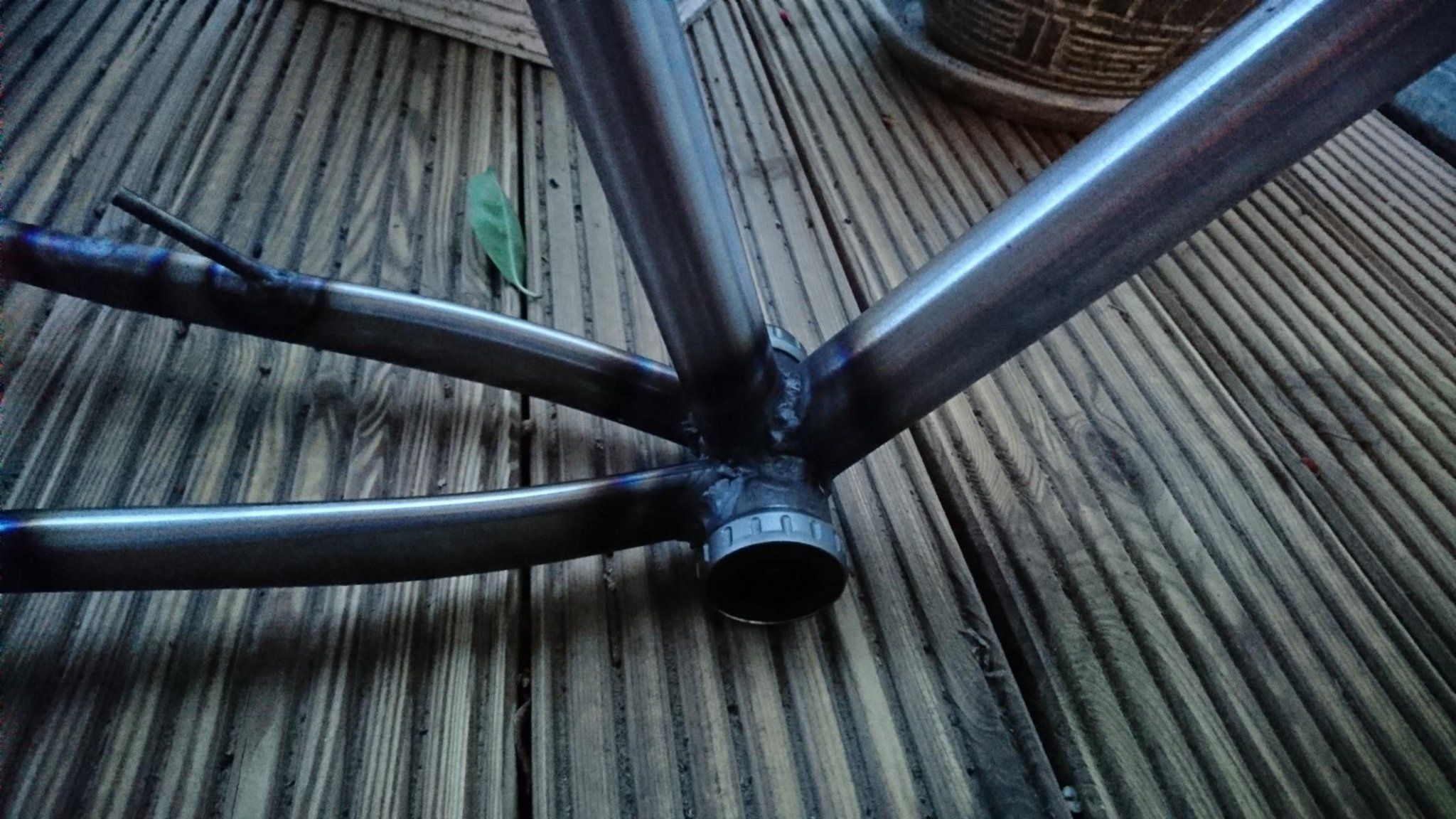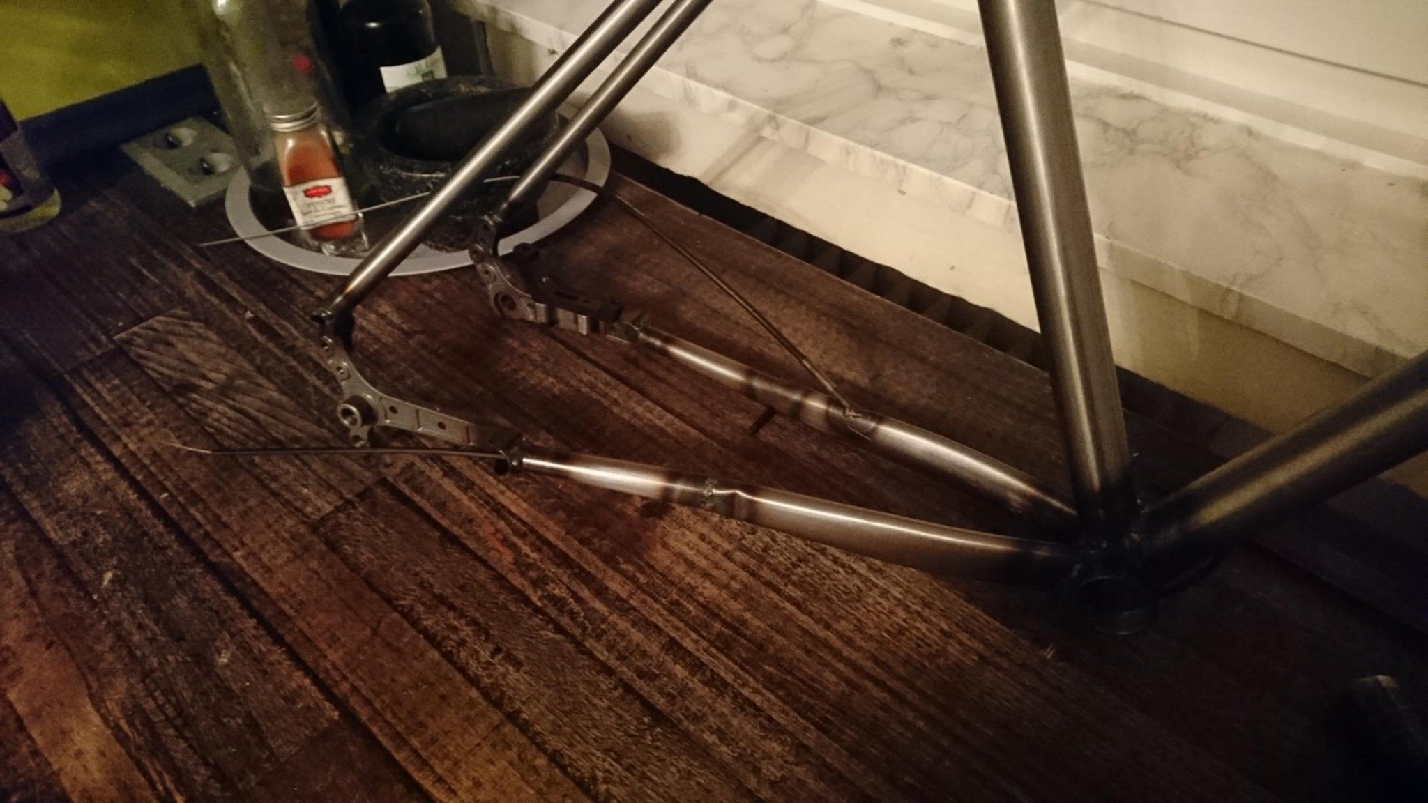 Geschweißt habe ich hier mit etwas über 60 Ampere. Der Tretlagerbereich hat mich wirklich genervt. Da bin ich falsch rangegangen. Mit den 60 A hat man das Tretlager wunderbar erwärmt, aber nicht zu einer Verbindung bewegen können, bevor das Sitzrohr wegschmilzt. Leider habe ich ert bei der letzten Strebe begriffen, dass ich lieber mal mit 85A pulsierend da ran gehen sollte. So kann die kurze starke Erwärmung vom Tretlager nicht direkt abgeführt werden und man braucht nicht so lange, dass alle Rohre drum herum schon glühen. Wieder etwas gelernt!
