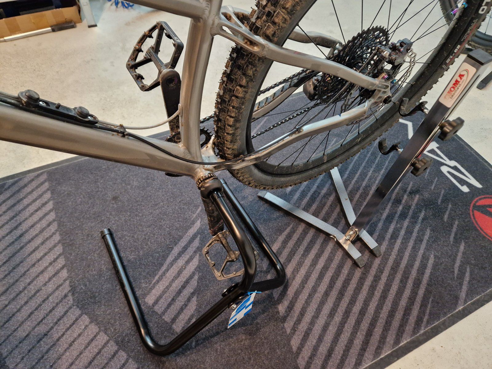 Wenn Dreck in der Kurbel ist, geht das Bike nicht so ganz leicht drauf. Ist etwas mehr Gefummel. Auch dreht sich die Kurbel nicht so leichtgängig wie auf dem Gioma. Auch meine Stamp 7 large passen vorbei.